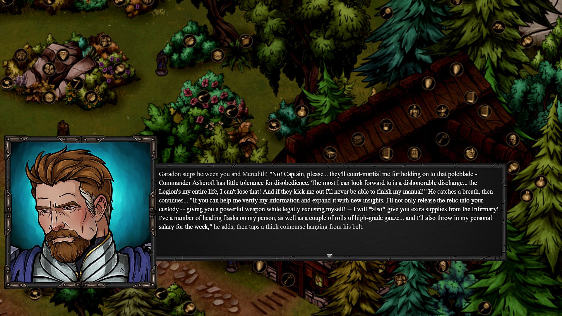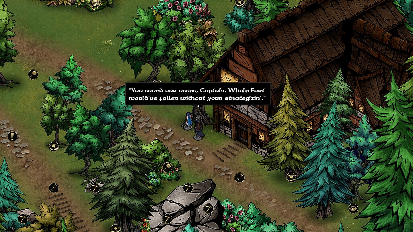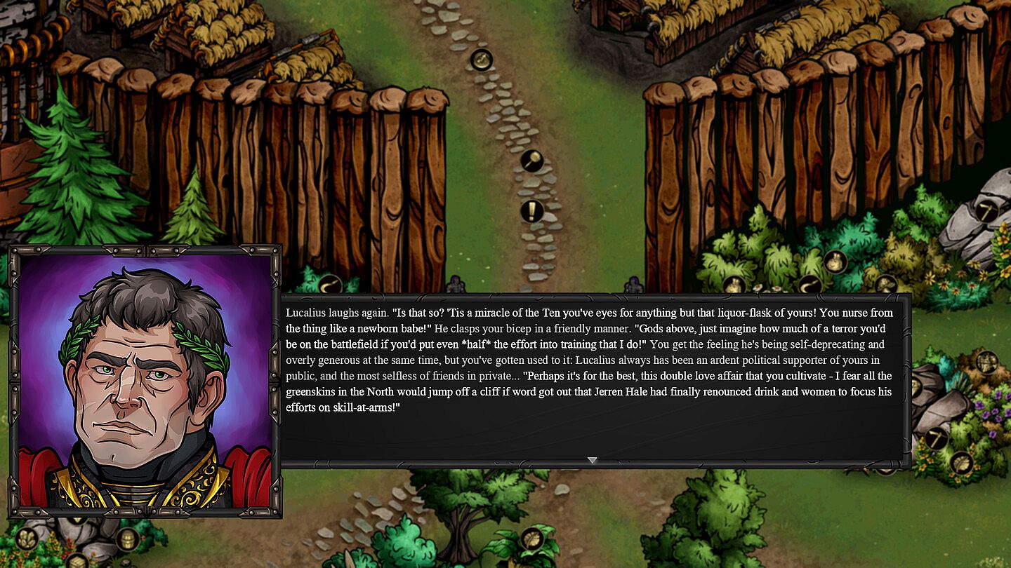 You are Captain Hale, a war-hero and frontiersman based by the remote Legion outpost of Fort Ninevus. Accompanying you is your trusty sidekick (and ex-girlfriend) Meredith von Mhyr, a sexy half-elven paladin. She's your confidante, best friend, and occasional lover...