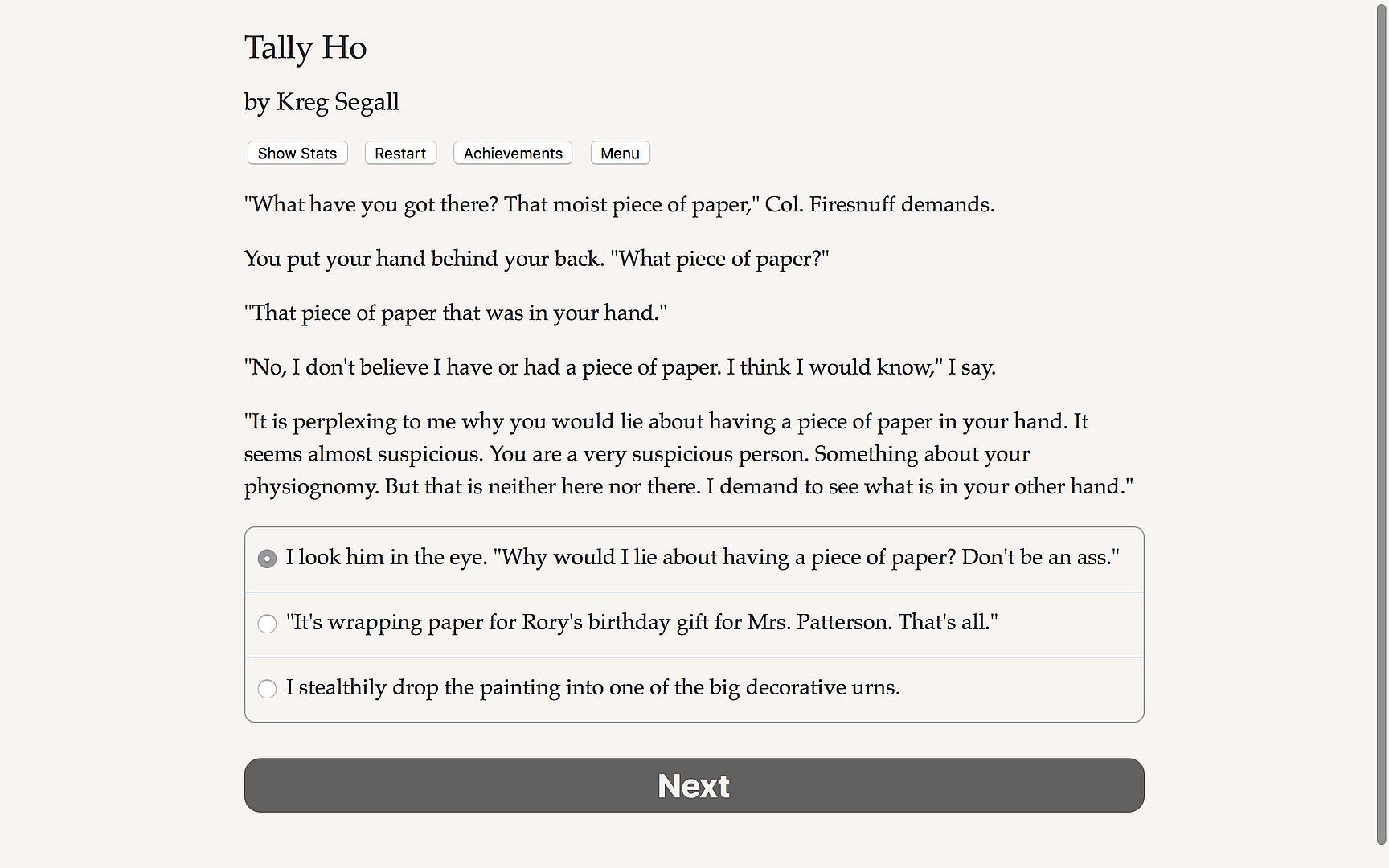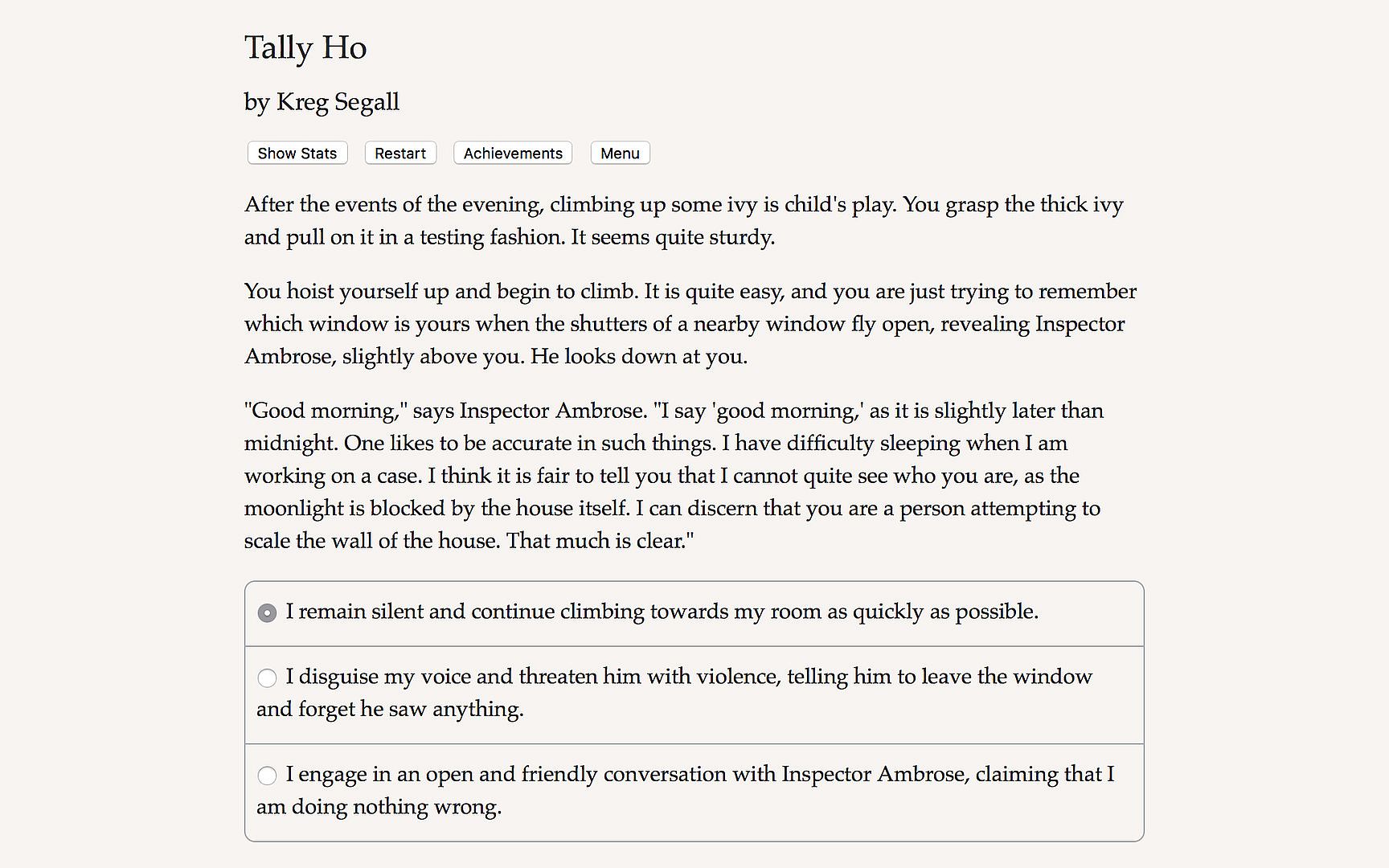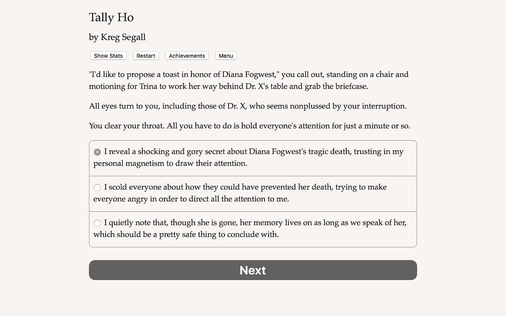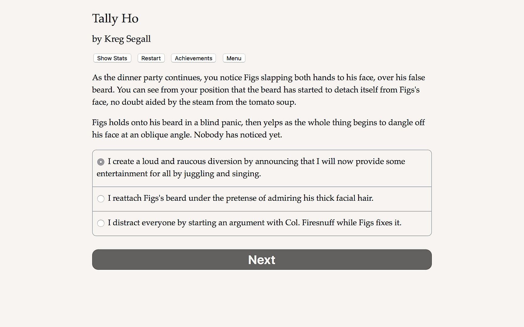 Tally Ho is a 600,000 word interactive comedy of manners by Kreg Segall, where your choices control the story. It's entirely text-based—without graphics or sound effects—and fueled by the vast, unstoppable power of your imagination.