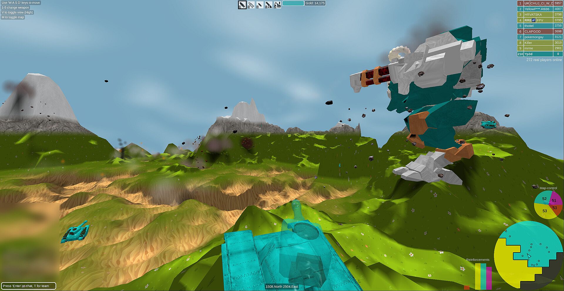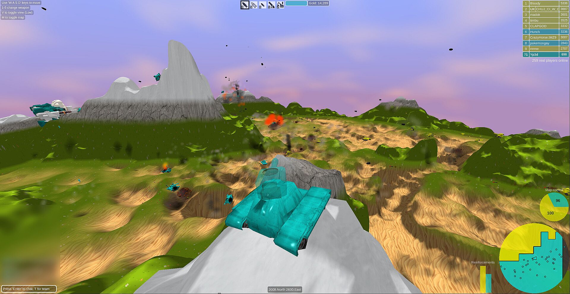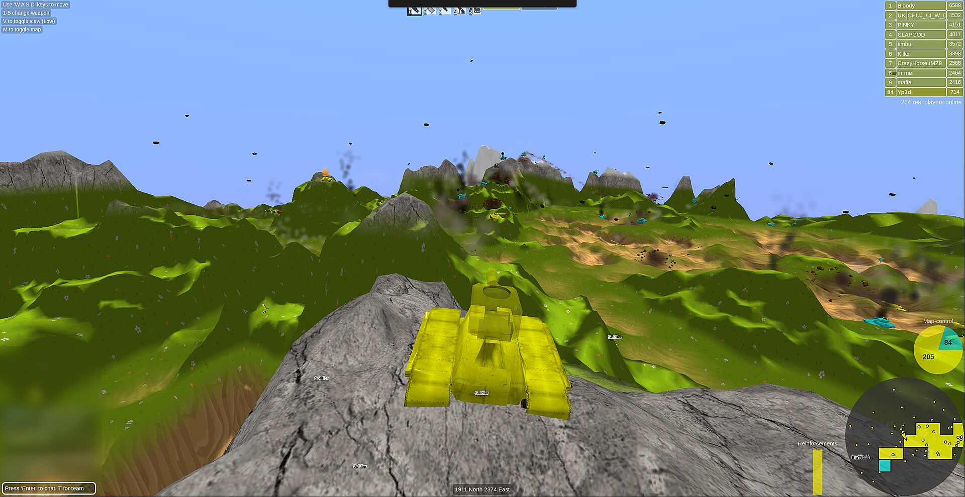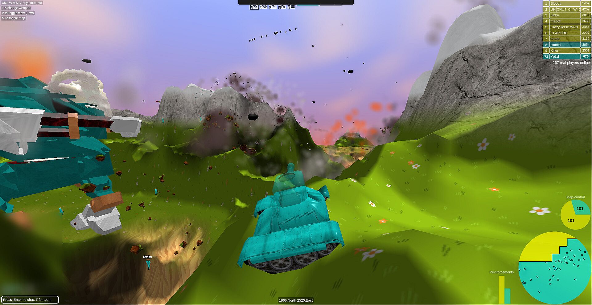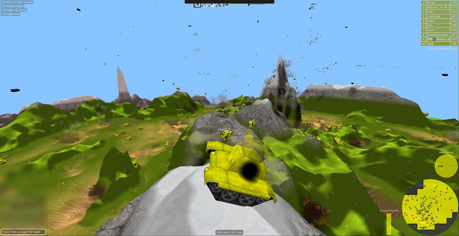 Play on servers up to 1000 players concurrently on giant maps with destructible terrain,