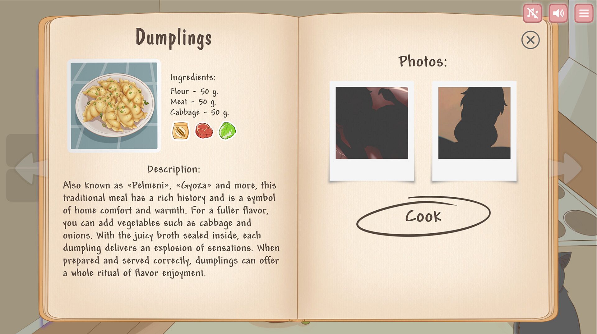 A cute and cozy game about cooking and dating. Cook different food in interesting games, and then spend unforgettable evenings with different consequences with cute girls.