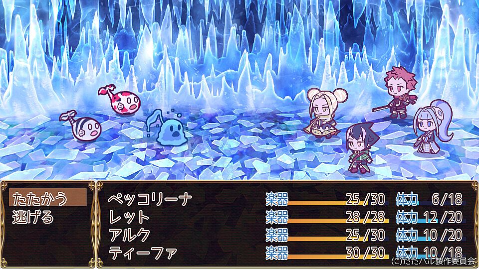 バトルシステムはシンプルなターン制のコマンドバトルですが、いわゆる「HP」の代わりとして「楽器耐久力」というパラメーターがあります。
