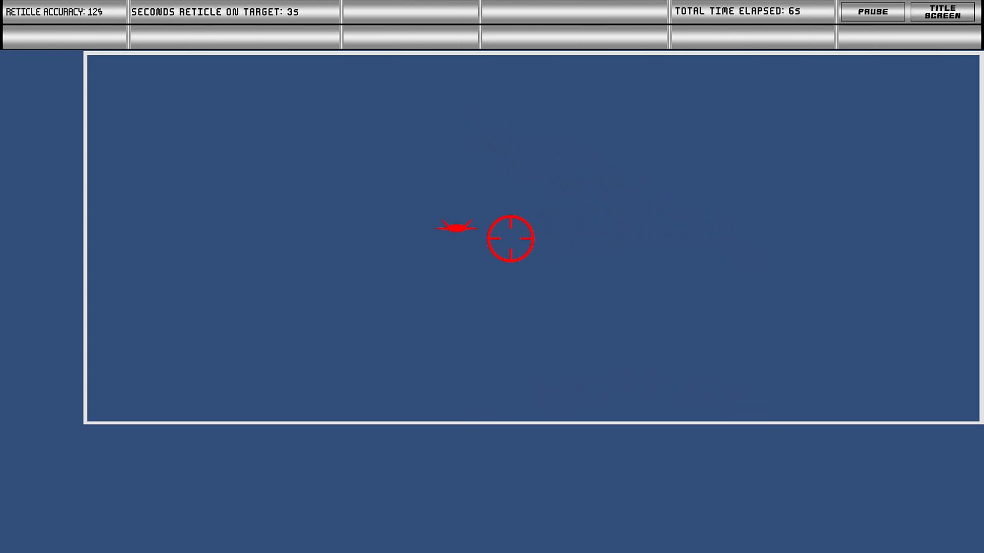 • [TBAS and ASTB-E / PBMB] RETICLE TRACKING TEST (Flight Stick Recommended): An aircraft silhouette travels around the screen. A flight stick, "WASD" keyboard keys, or gamepad control stick are used to move the reticle on the screen over the aircraft silhouette. The goal is to raise your "Reticle Accuracy", which increases when the reticle is over the aircraft silhouette.