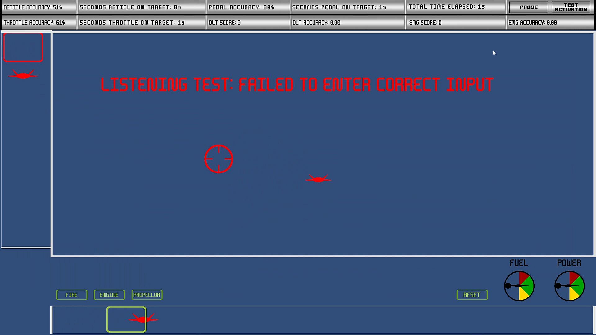 • [ASTB-E / PBMB] EMERGENCY SCENARIO TEST (Audio Required): You must memorize three scenarios and how to adjust two separate gauges for each. Pressing "Reset" will confirm your gauge positions. You will lose points if your gauge positions are incorrect, and you will gain points if they are correct.