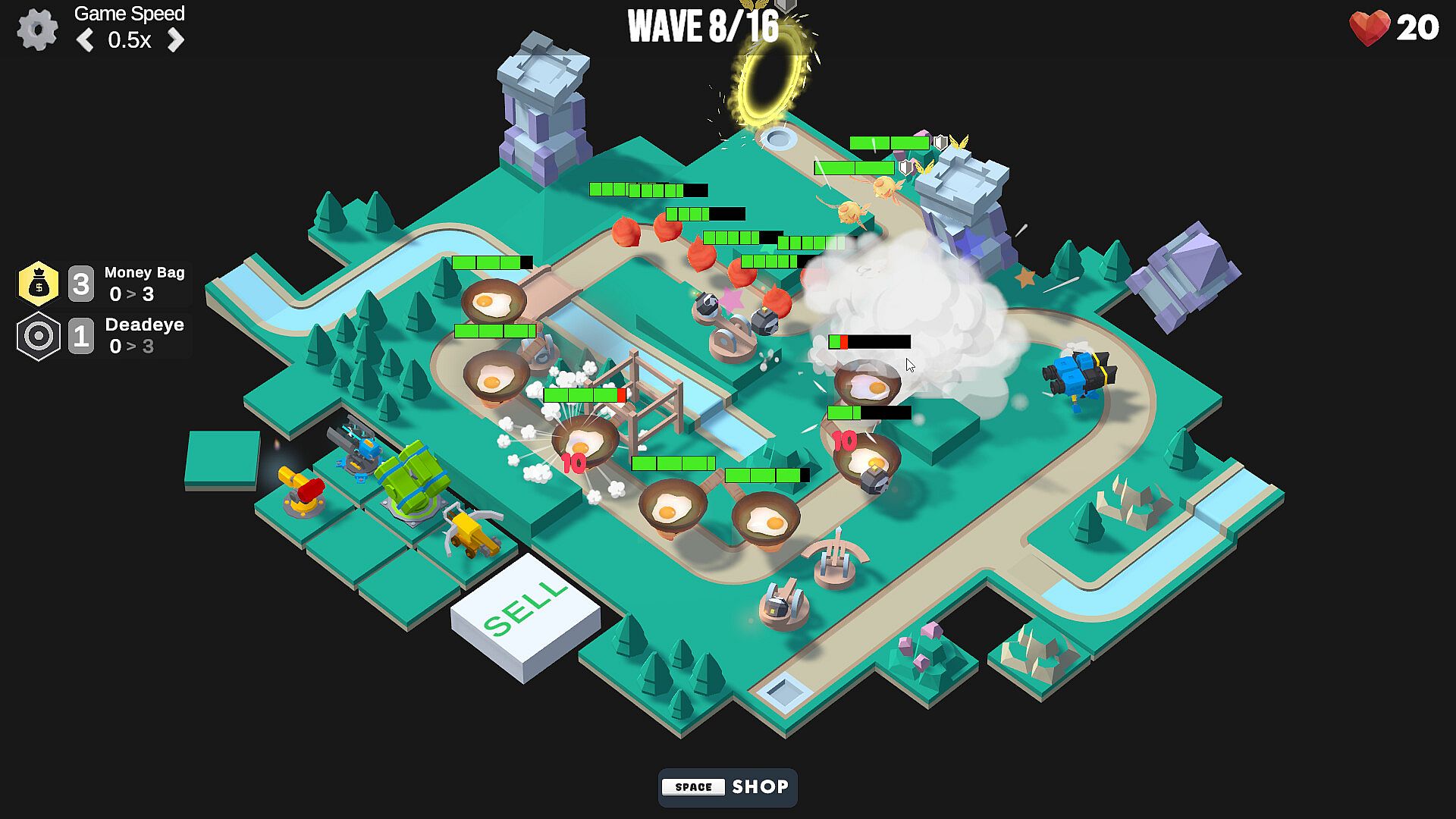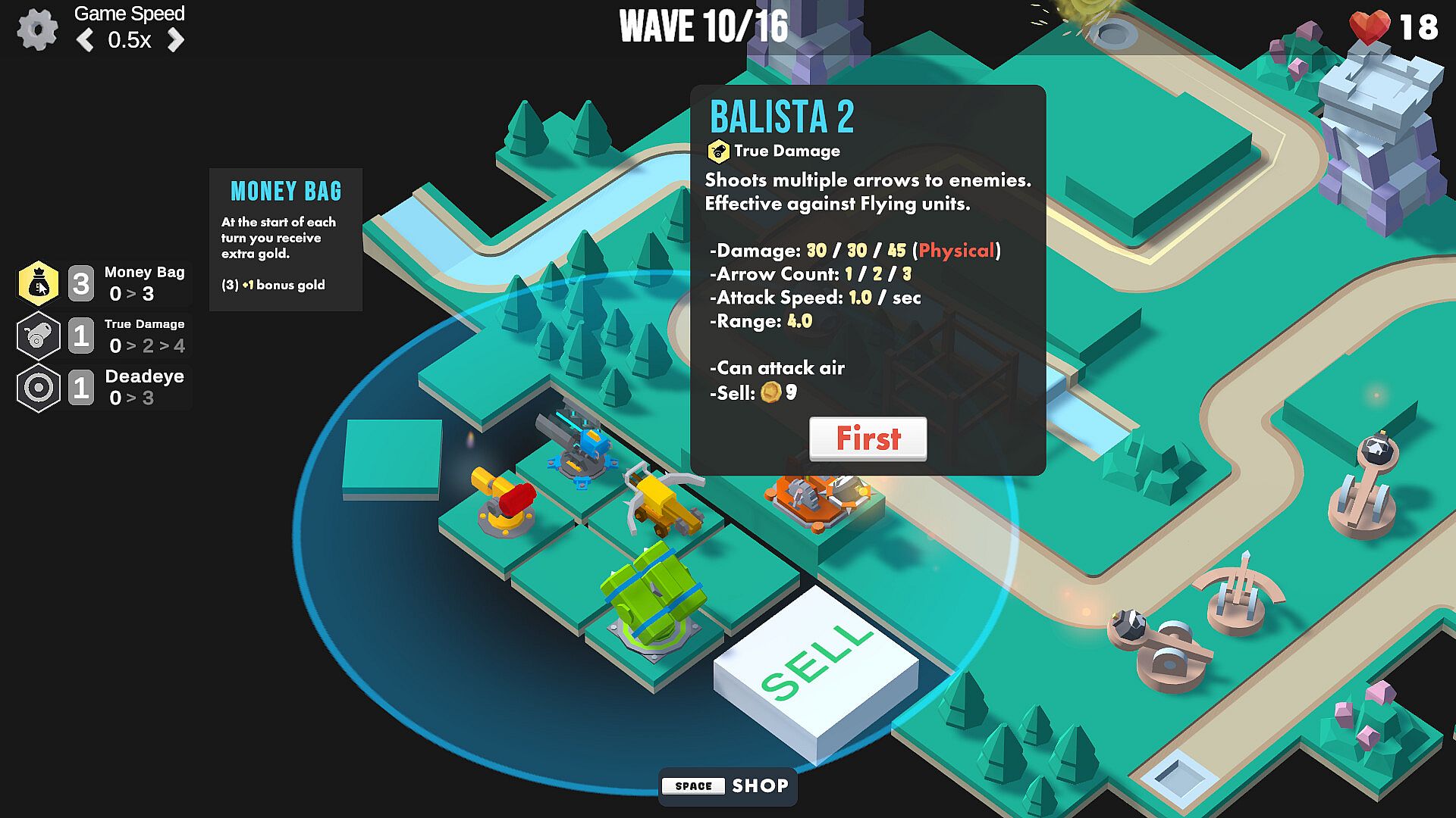 - Economy Management: Each turn, random towers and spells appear in the shop according to your level. Use gold to buy towers and spells, gain interest, and level up. Proper economy management is crucial for building a strong defense.