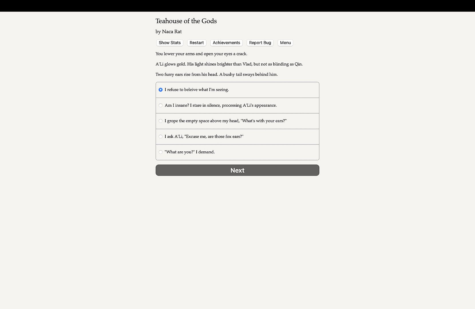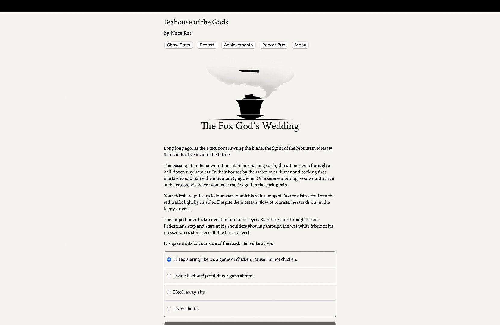 Teahouse of the Gods is a 250,000-word interactive novel by Naca Rat. It's entirely text-based, without graphics or sound effects, and fueled by the vast, unstoppable power of your imagination.
