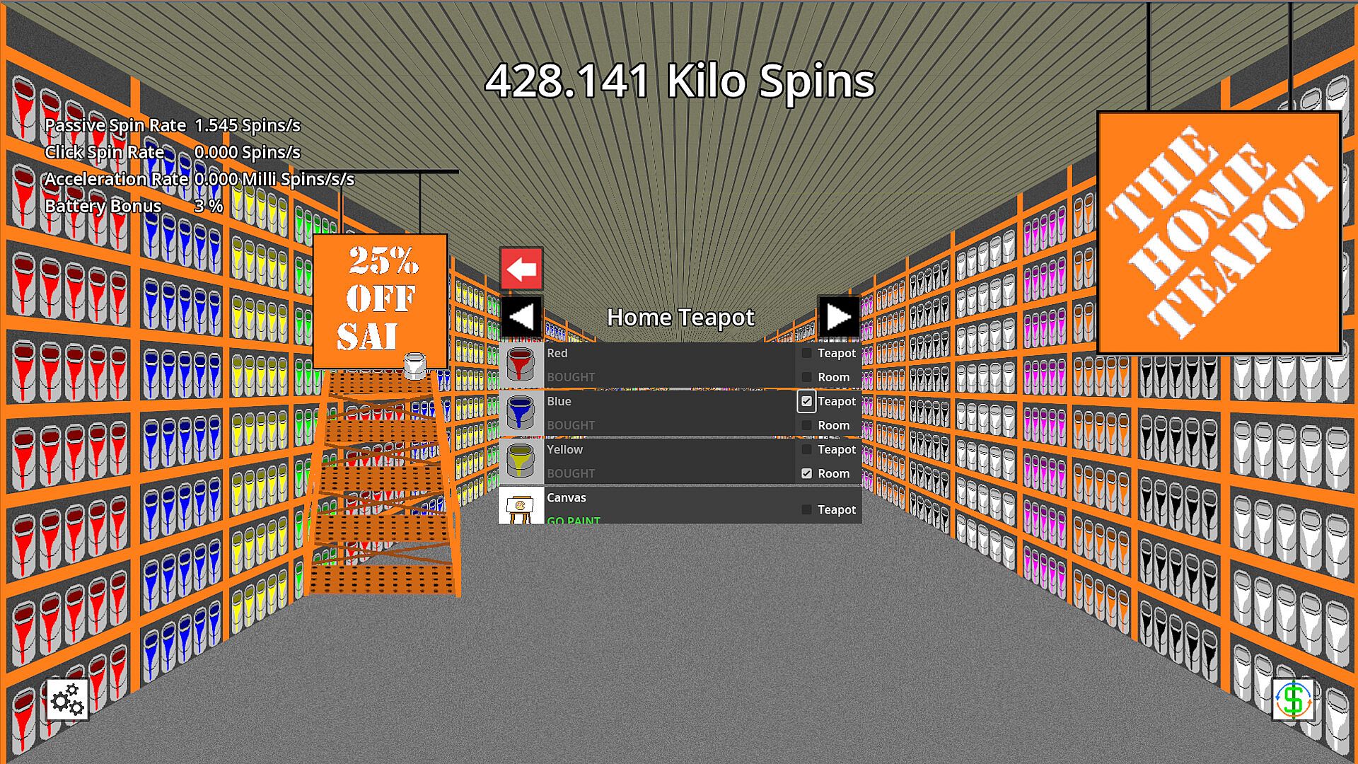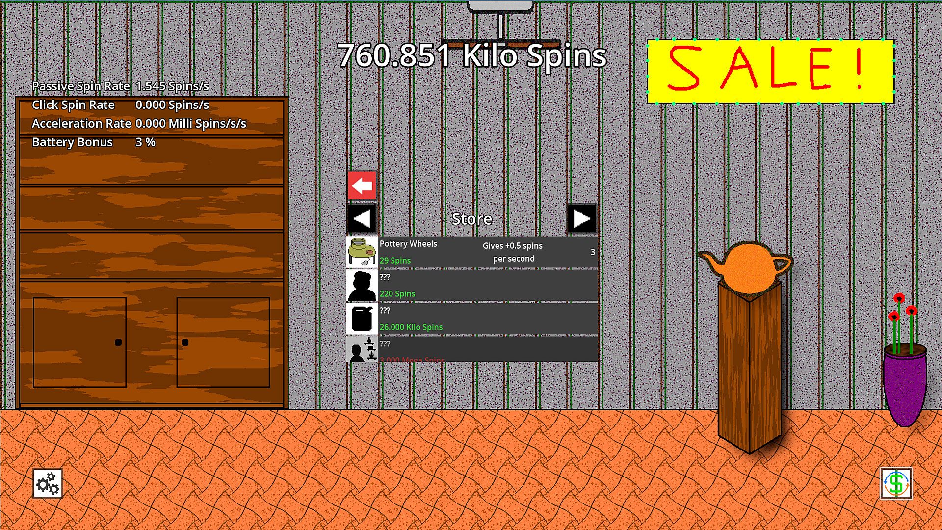 From the humble Pottery Wheel to the powerful Gas Station, Teapot Spinner features a wide variety of upgrades to enhance your teapot spinning experience. Use your spins to purchase these, and watch as your teapot spinning rates multiply. Each upgrade has a unique feature to affect the teapot- collect them all and find the best way to spin that teapot, or customize your teapot with the paints and canvas. There may even be a way to spin back in time…