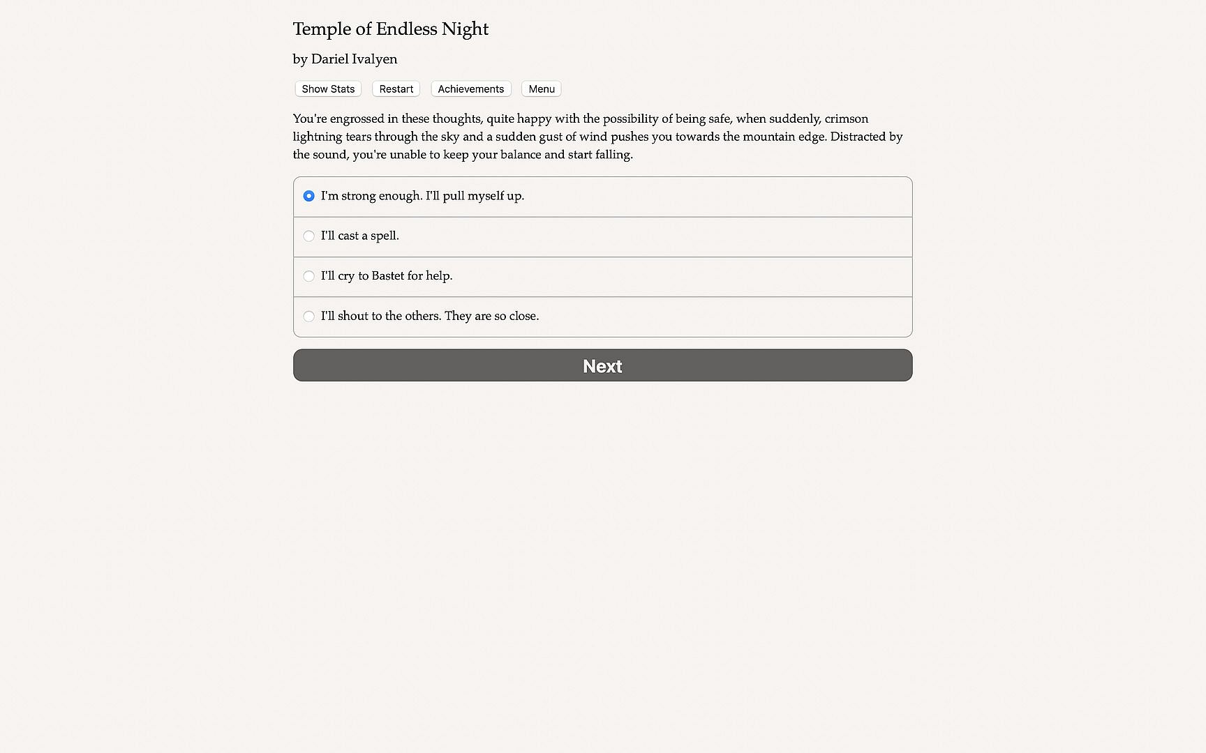 Temple of Endless Night is a thrilling 200,000 word interactive fantasy novel by Dariel Ivalyen, where your choices fully control the story. It's entirely text-based—without graphics or sound effects—and fueled by the vast, unstoppable power of your imagination.