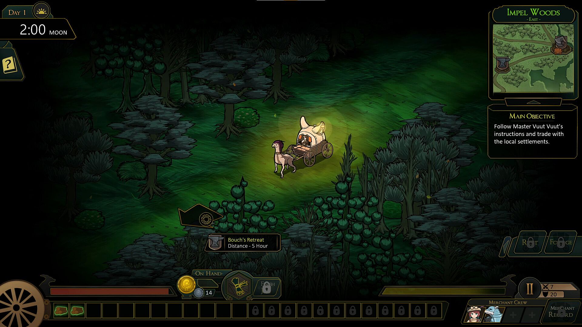 Bandits and wild beasts are constantly eyeing your wagons. Experience turn-based combat with a merchant twist: each of your trading goods can be used for attacking or defending with its own unique effects.