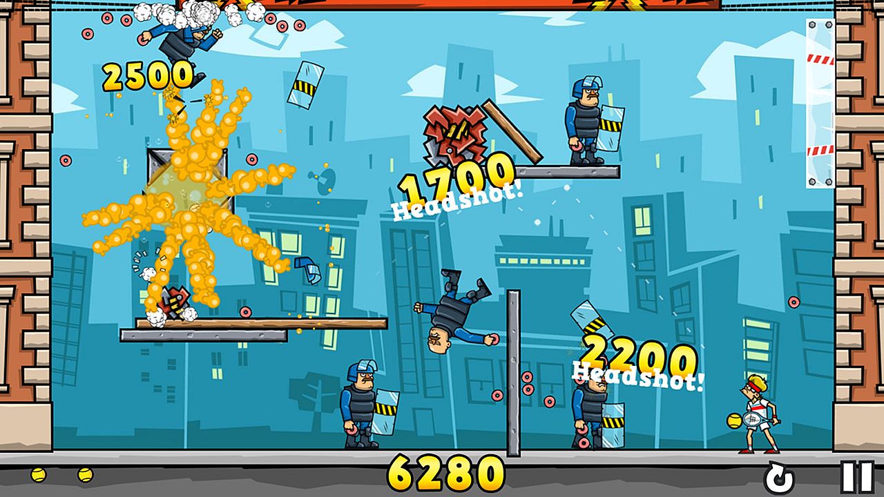 Help Pete Pagassi to save the city from an evil energy drink corporation Explodz. Knock out creepy clowns, evil riot police and other Explodz-addicted maniacs with a tennis ball in the face. Bounce the ball off walls to reach targets lurking in cover and watch them tumble. Trigger masterful chain reactions and watch the chaos unfold. Finally enjoy the level finale in slow motion!