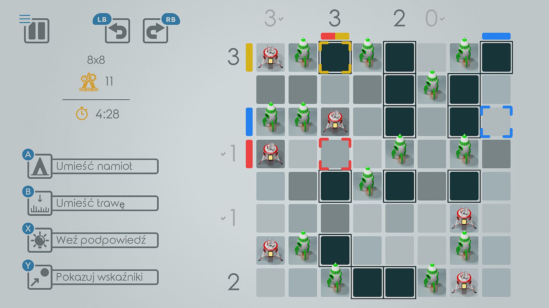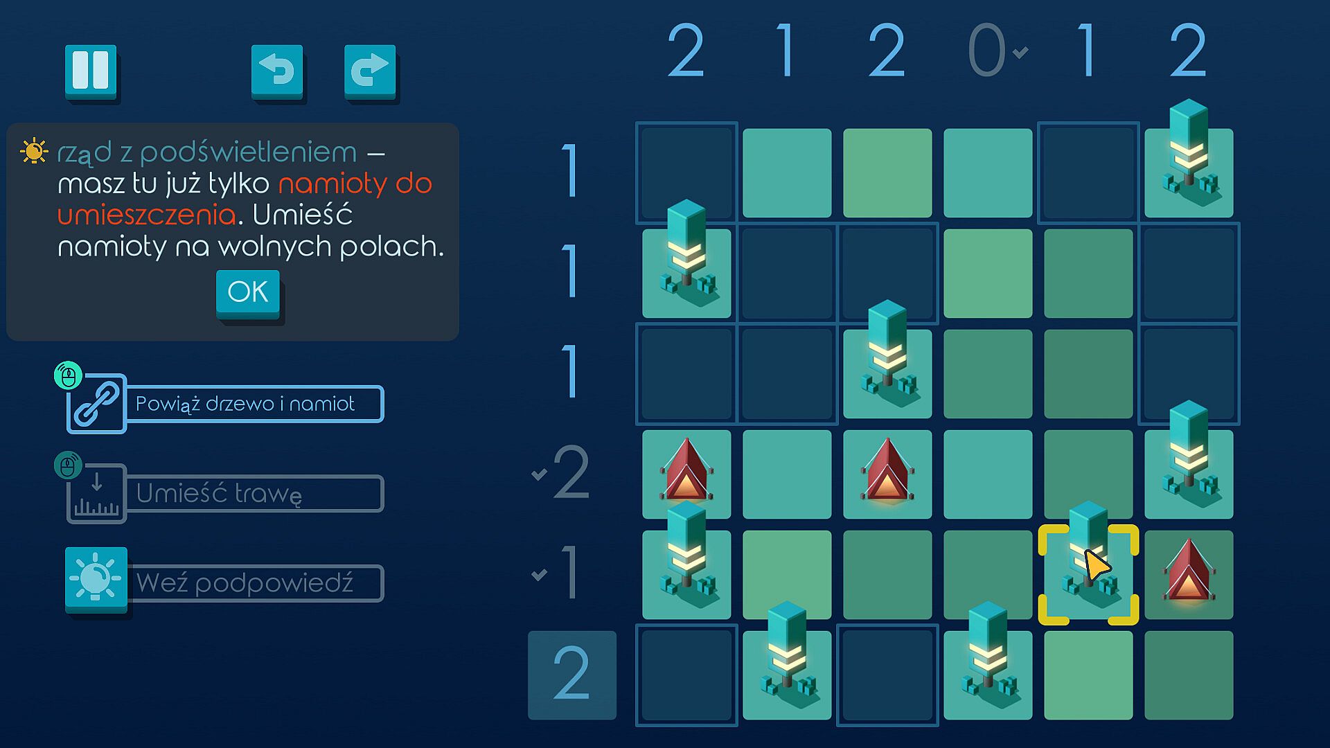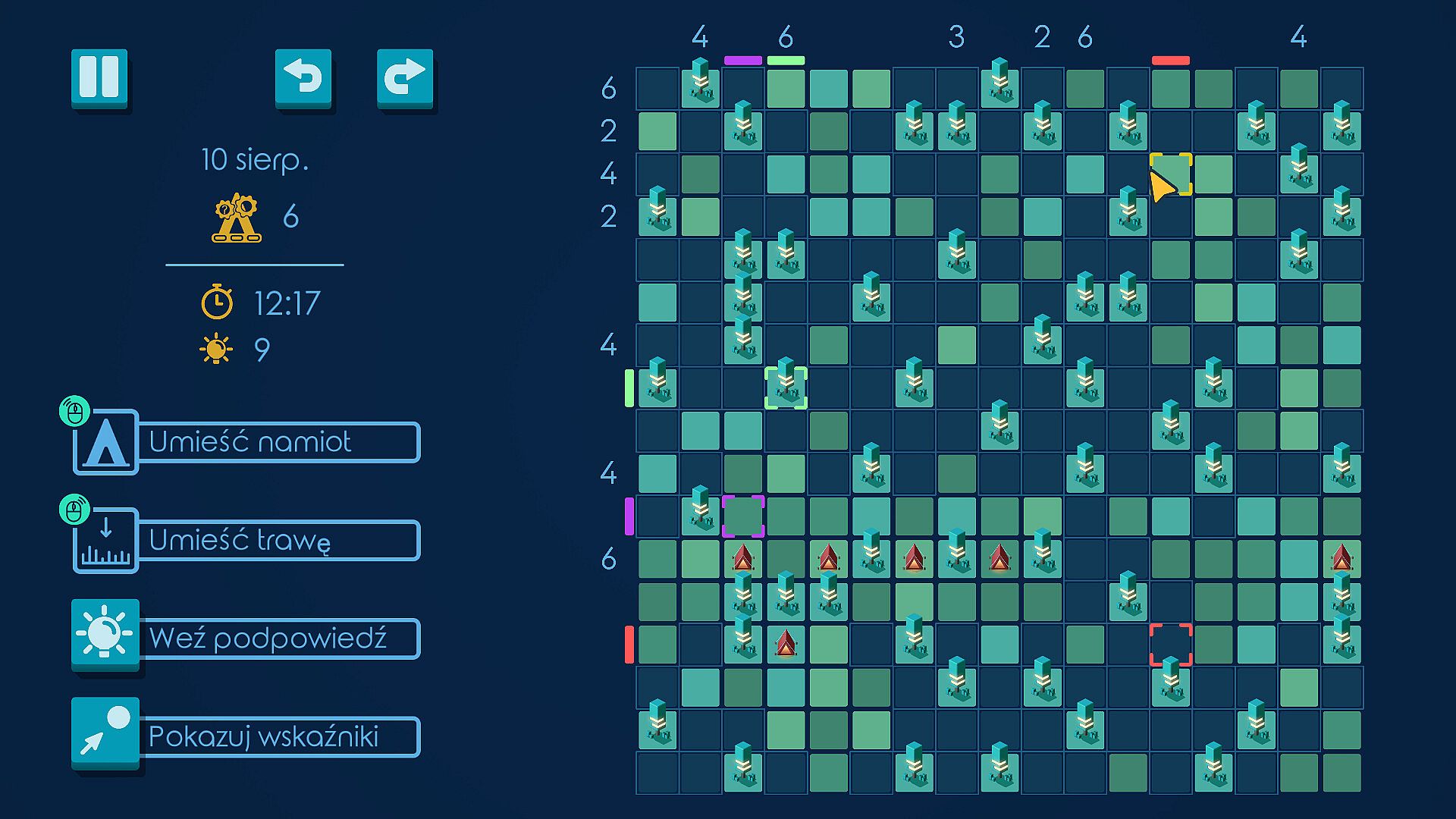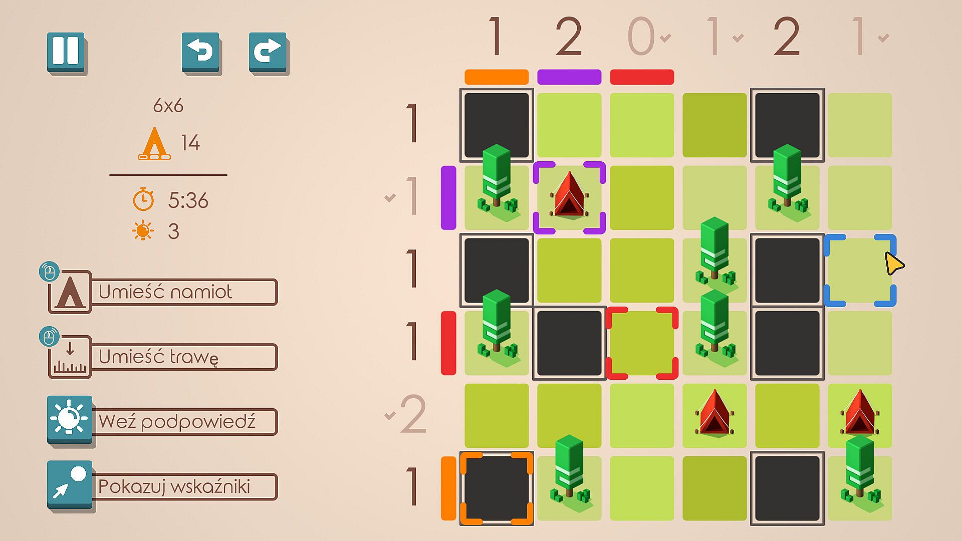 The numbers around the grid tell you how many tents must be placed in each row and column, but be careful: tents can’t touch each other. Each level has only one unique solution, so take your time and carefully plan your every move.