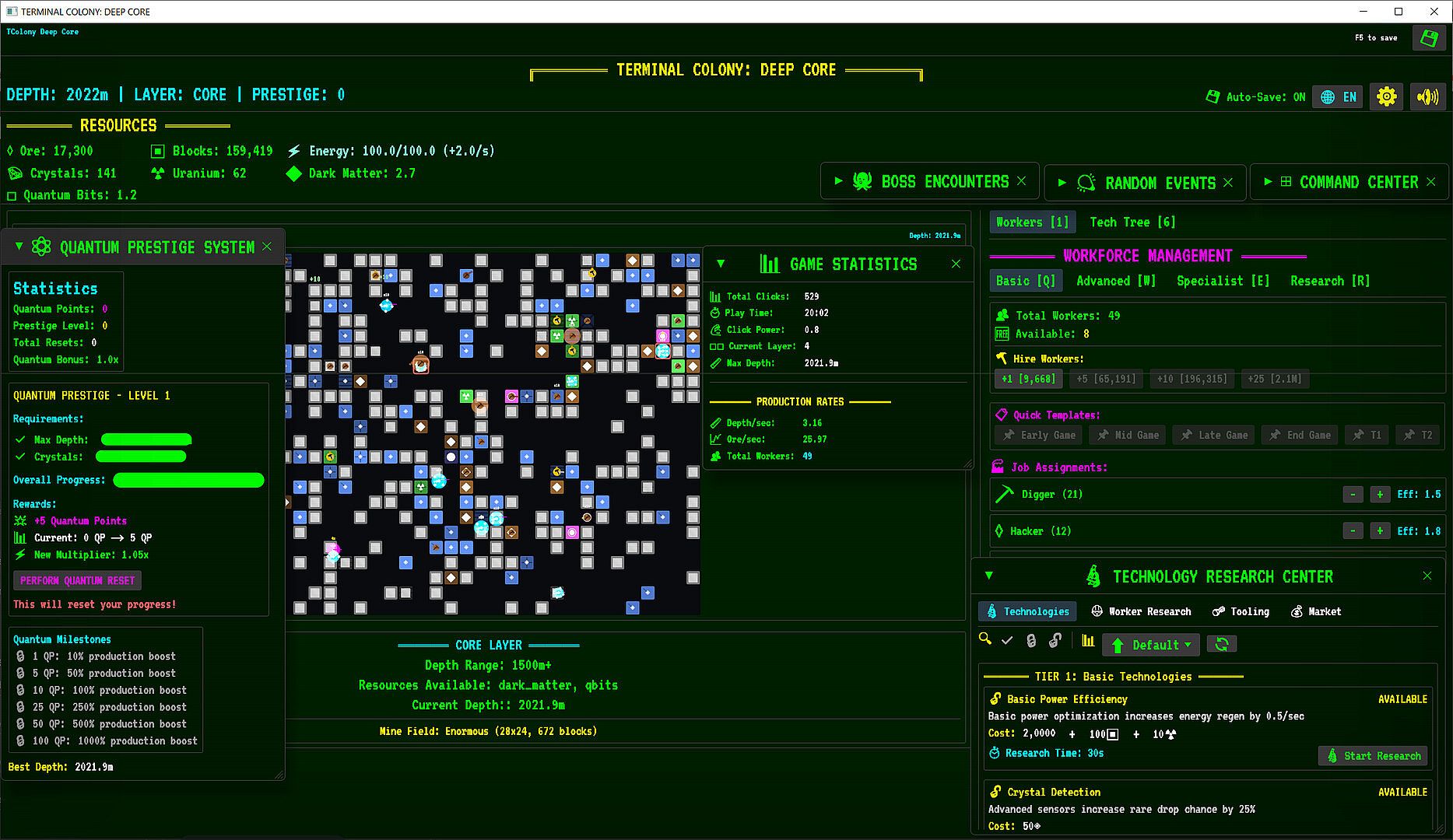 • Technology Tree: Research across 3 tiers (Basic, Advanced, Quantum) with meaningful upgrades and T key shortcut