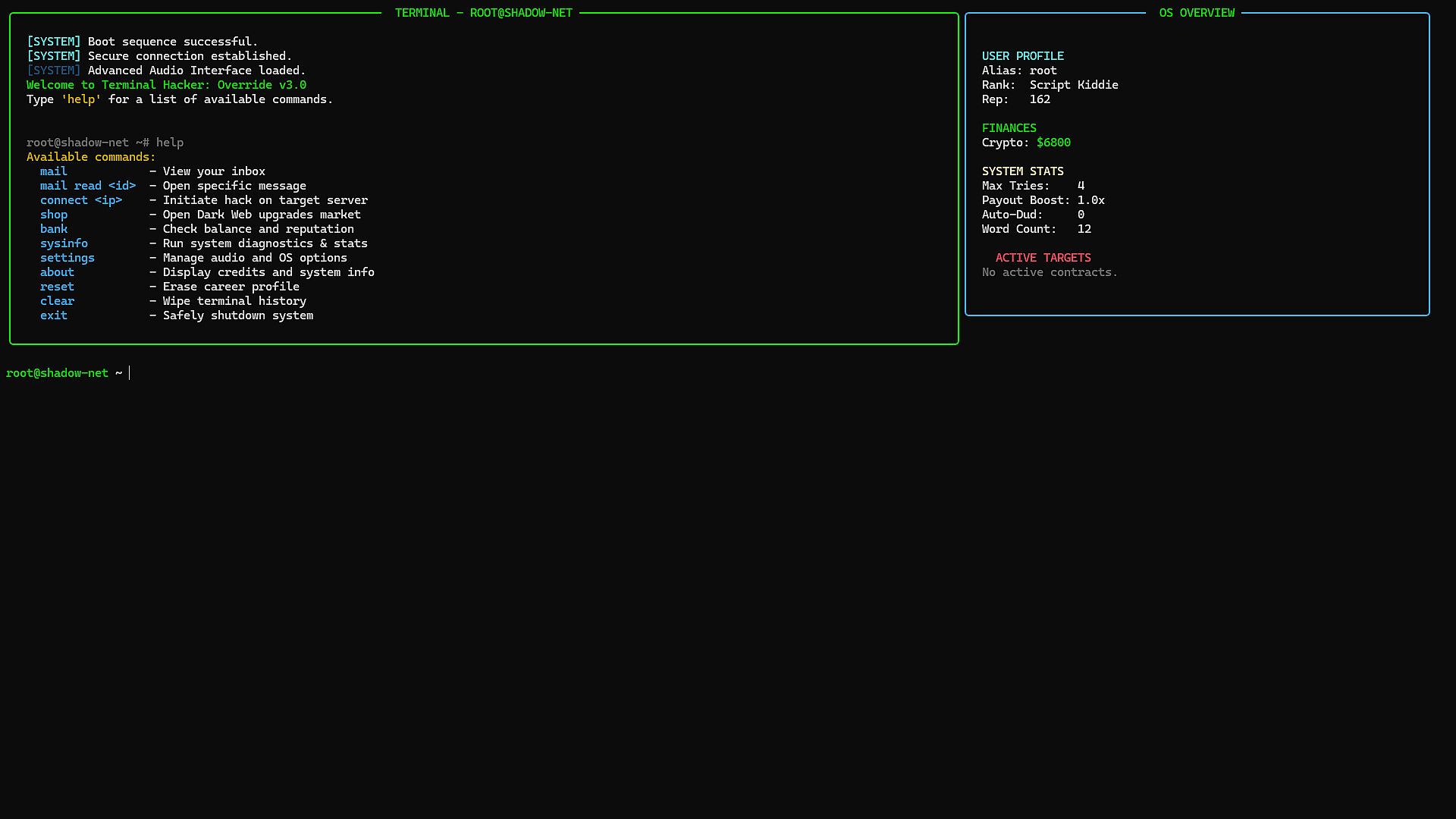 Welcome to Terminal Hacker: Override — the ultimate command-line experience for fans of deduction, logic puzzles, and retro hacker aesthetics. Forget flashy 3D visuals; your sharpest tool here is your mind.