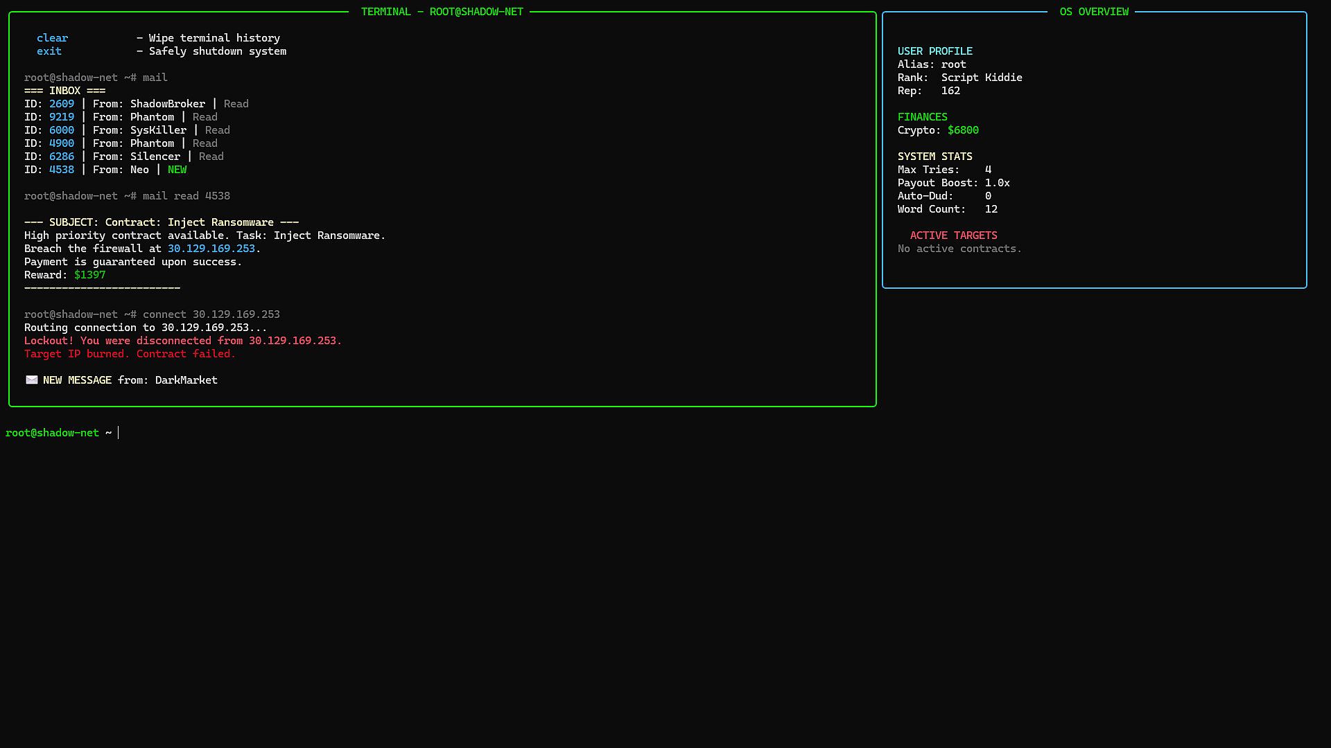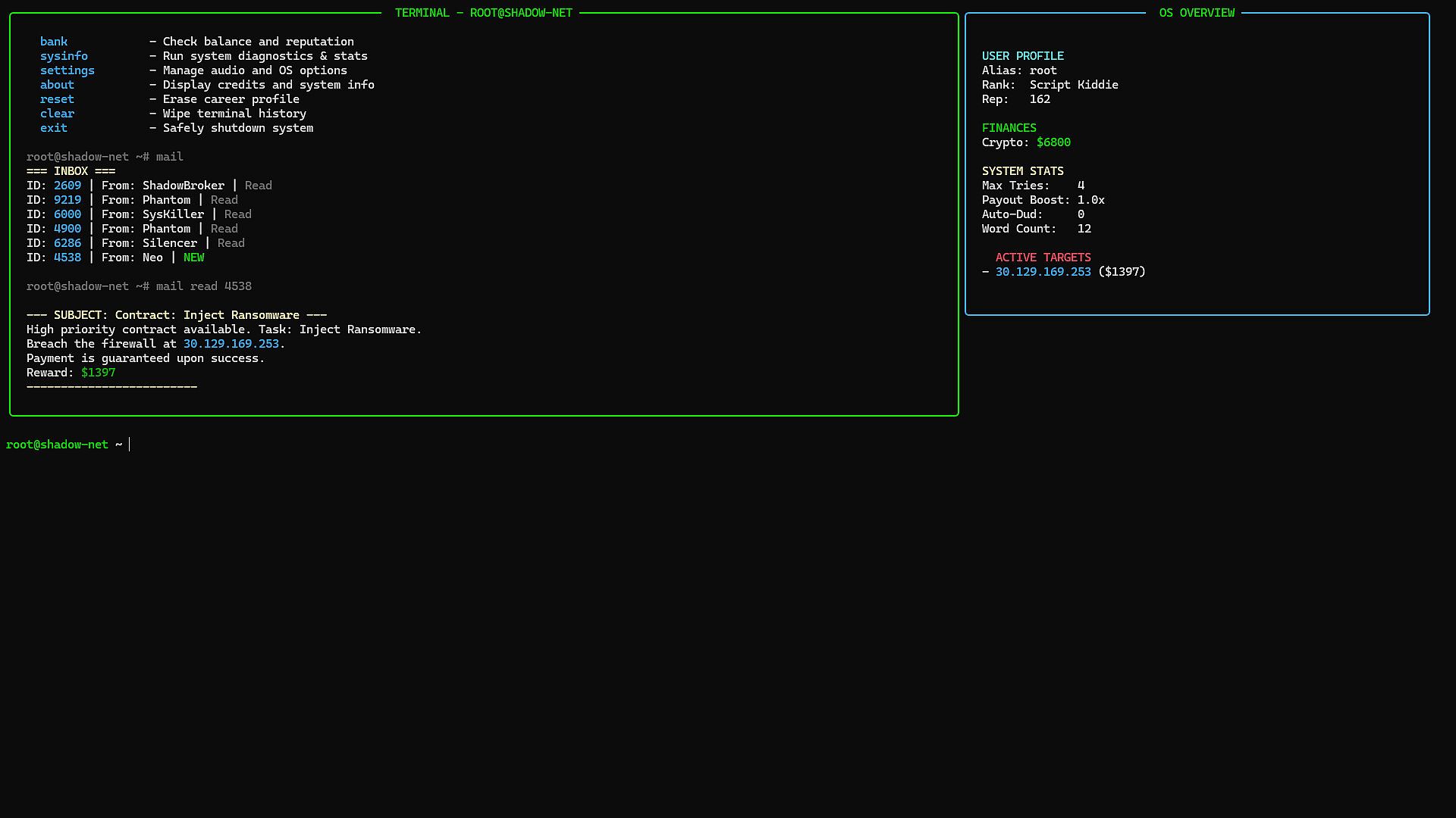 • Dual‑screen terminal OS — immersive, responsive text interface for inbox management, crypto balance checks, and live hacking.