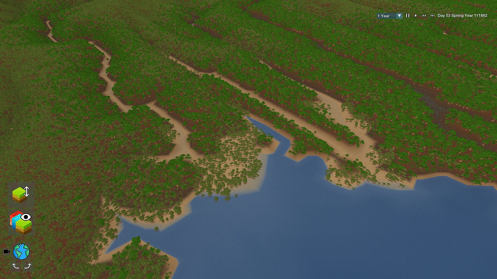 Harnessing the full power of modern GPUs, Terra Firma 2 simulates worlds at an unprecedented scale. Maps can span up to 16,000 km², simulating centuries of natural evolution in seconds, all while allowing you to zoom in to observe wildlife and terrain changes in real time.