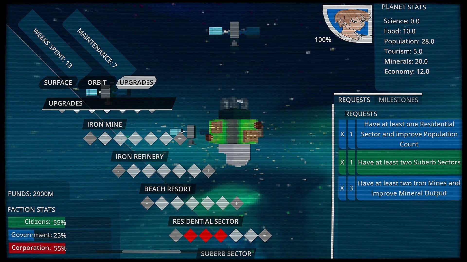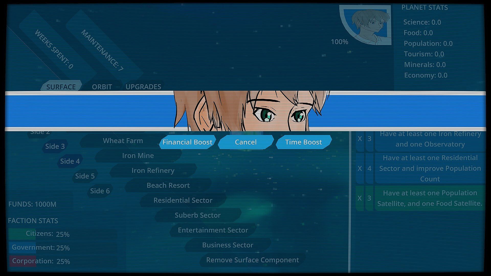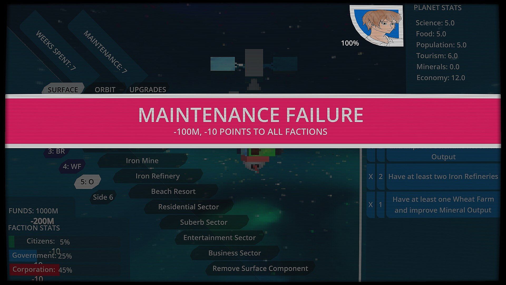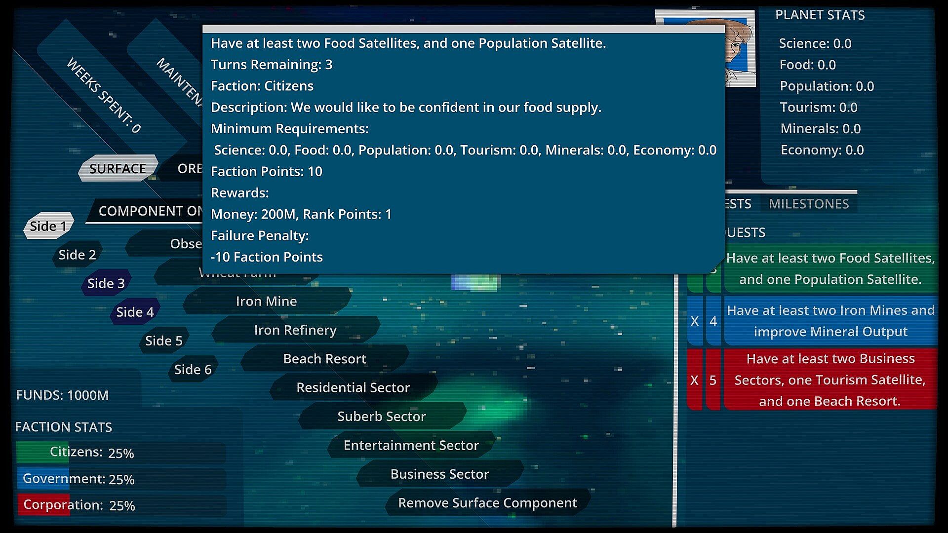 Meet structure construction quotas and reach planet stat thresholds within the time limit to fulfill requests from the planet's three factions. Earn funds and faction trust with each request that you complete. Don't favor or ignore requests from one side for too long, though, or it's all over.