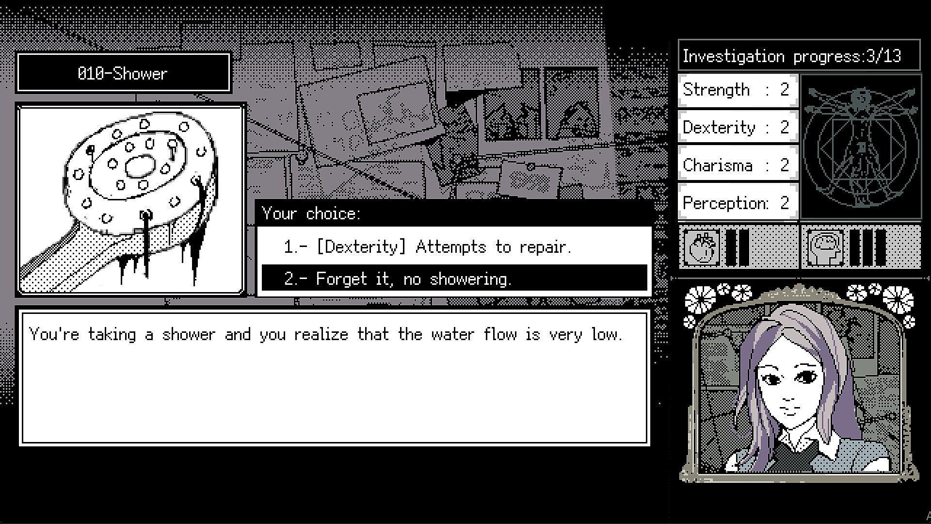 Terror Diversion is a text-based adventure game filled with numerous random events. You play as a girl haunted by spirits, who, after taking a leave from school, arrives in a strange town. Here, she must investigate a series of mysterious incidents while making sure she doesn't collapse from exhaustion or lose her sanity.