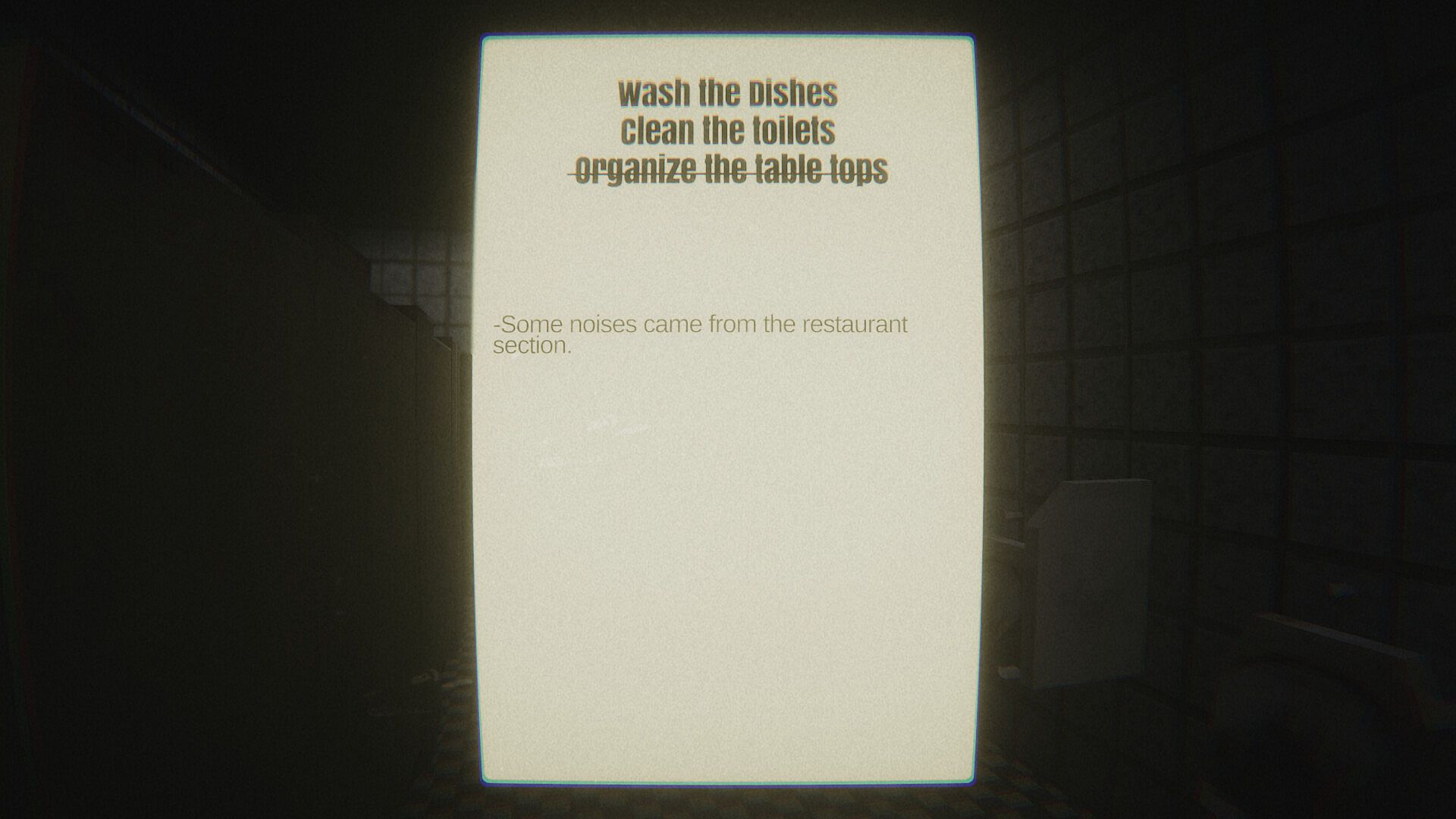 This is a first person atmospheric horror game. The style of the game is influenced by old graphics trend (PSX games etc). You play as a part timer in a restaurant. You wash dishes, take out trash, pump the toilets and organize the table tops. Restaurant manager calls and gives instructions through out the game. Check your notes to learn today's tasks or if you don't know what to do next.