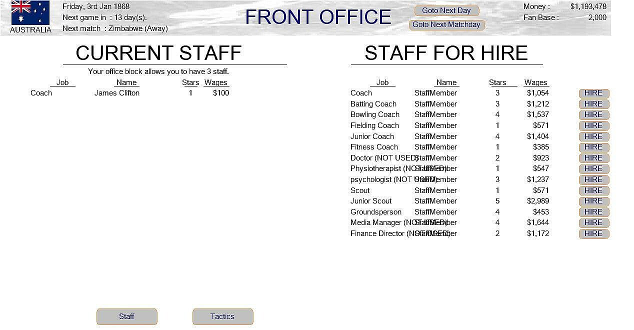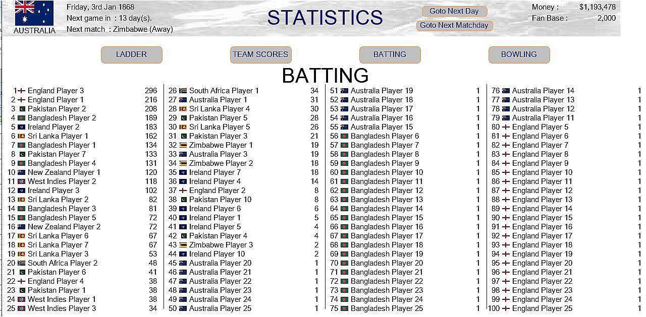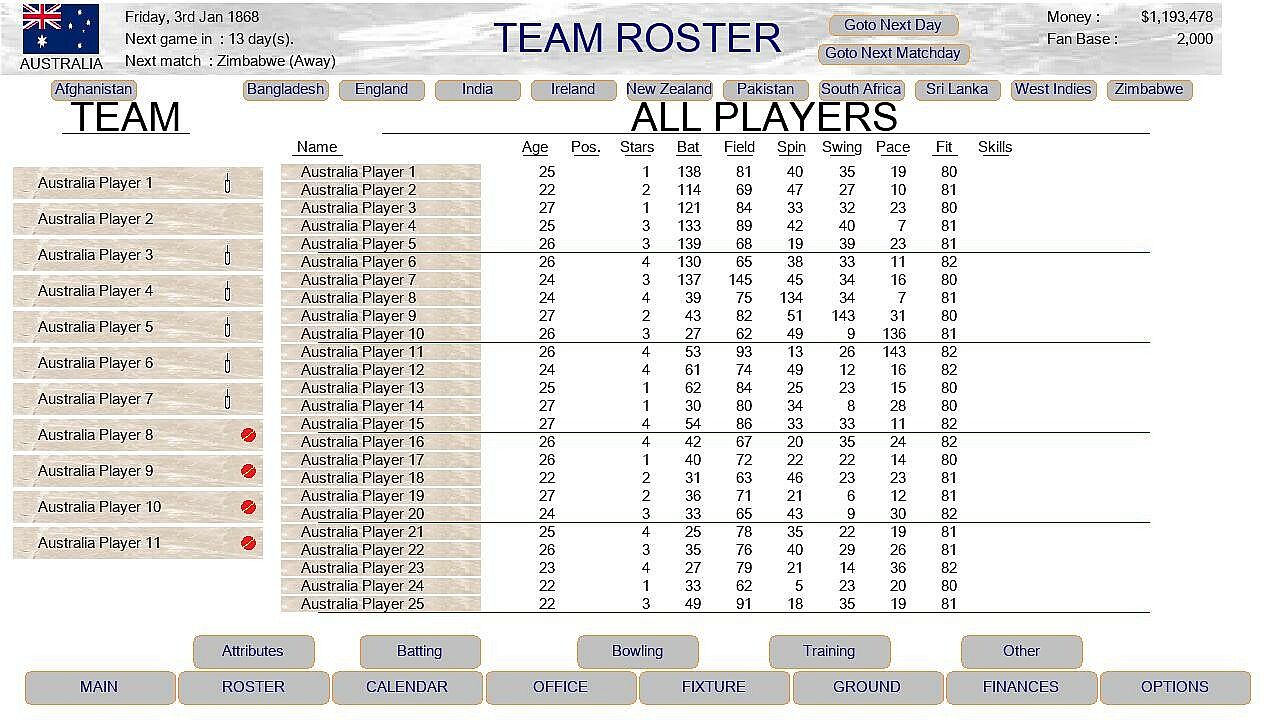 A cricket management game where you control the on, and off, decisions of a countries national cricket team.