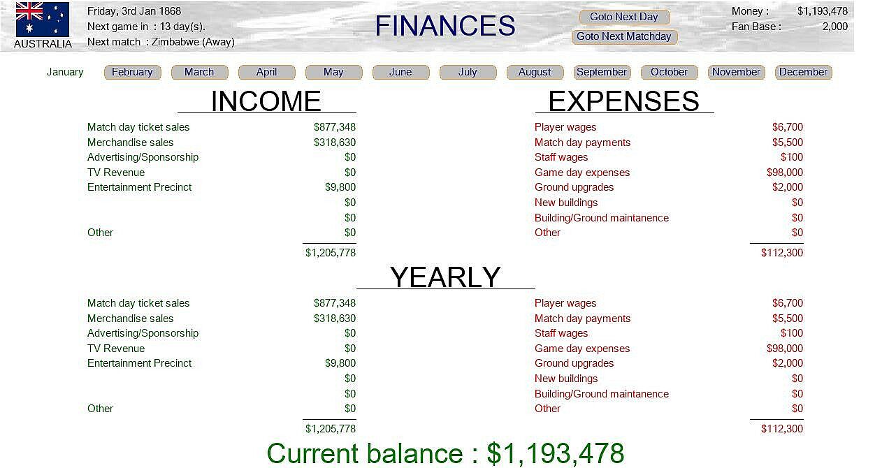 Starting in 1868 (Year of the first Australian touring team to England, the Australian team was entirely comprised of Aboriginals for this tour) you will take your country on a year long journey to play each other test team once at home, and another time away.