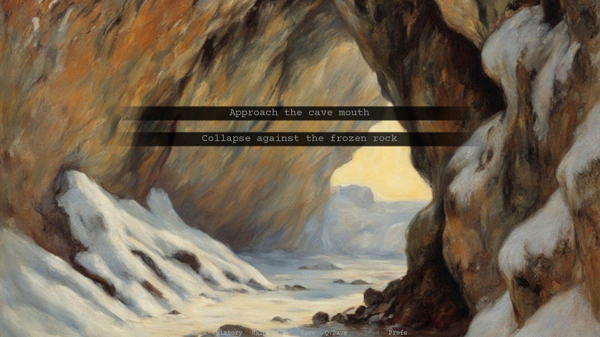The outside world is a cold, harsh place. That's why you came here. The cavern provides you with a minimum of shelter and - more importantly - the hope that you will one day be chosen to receive a place by the enormous fire hidden away in the dark depths below.