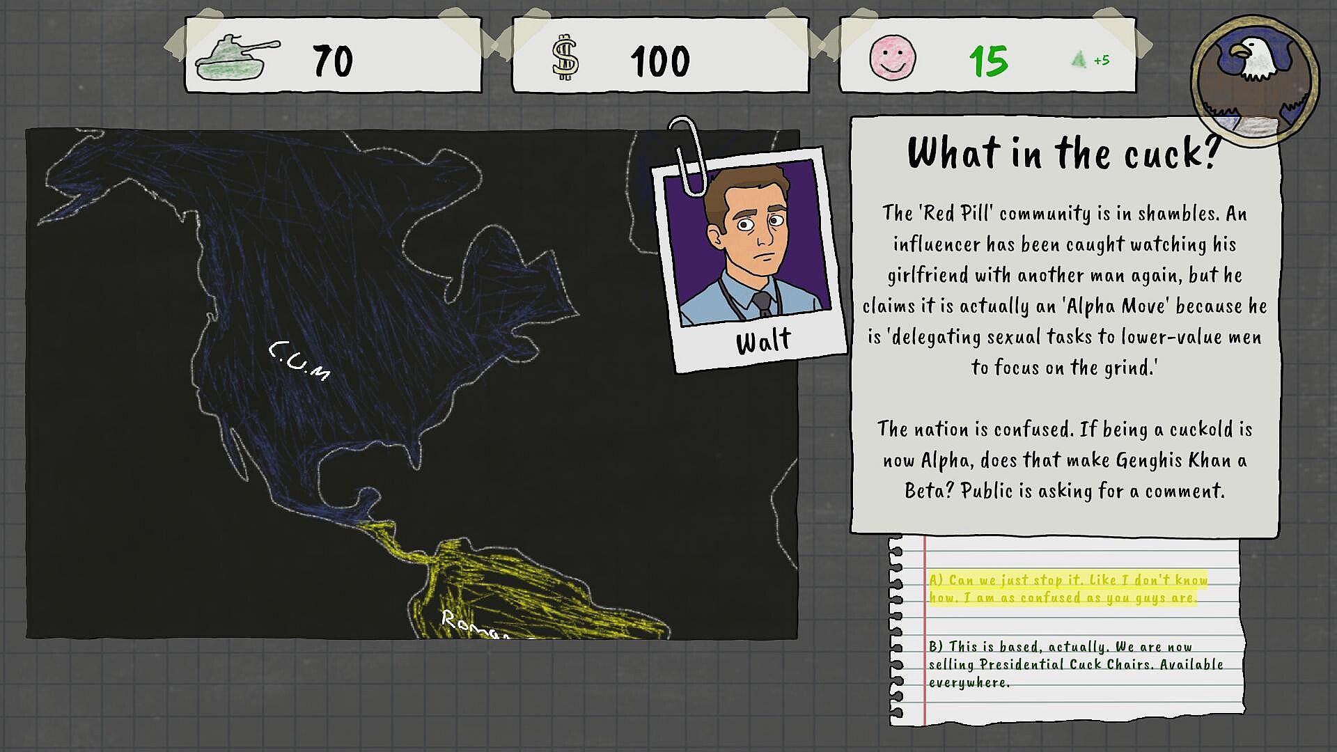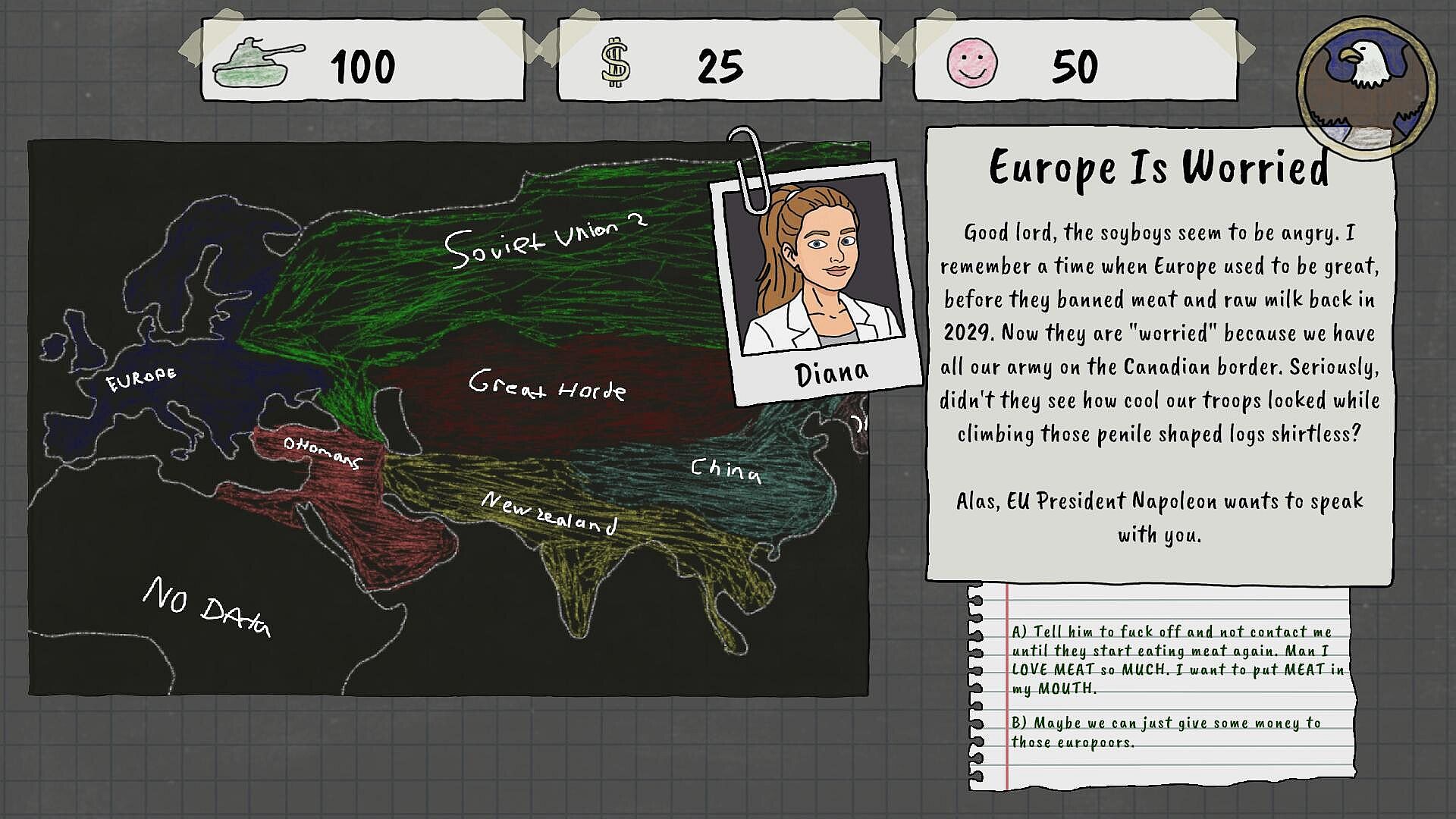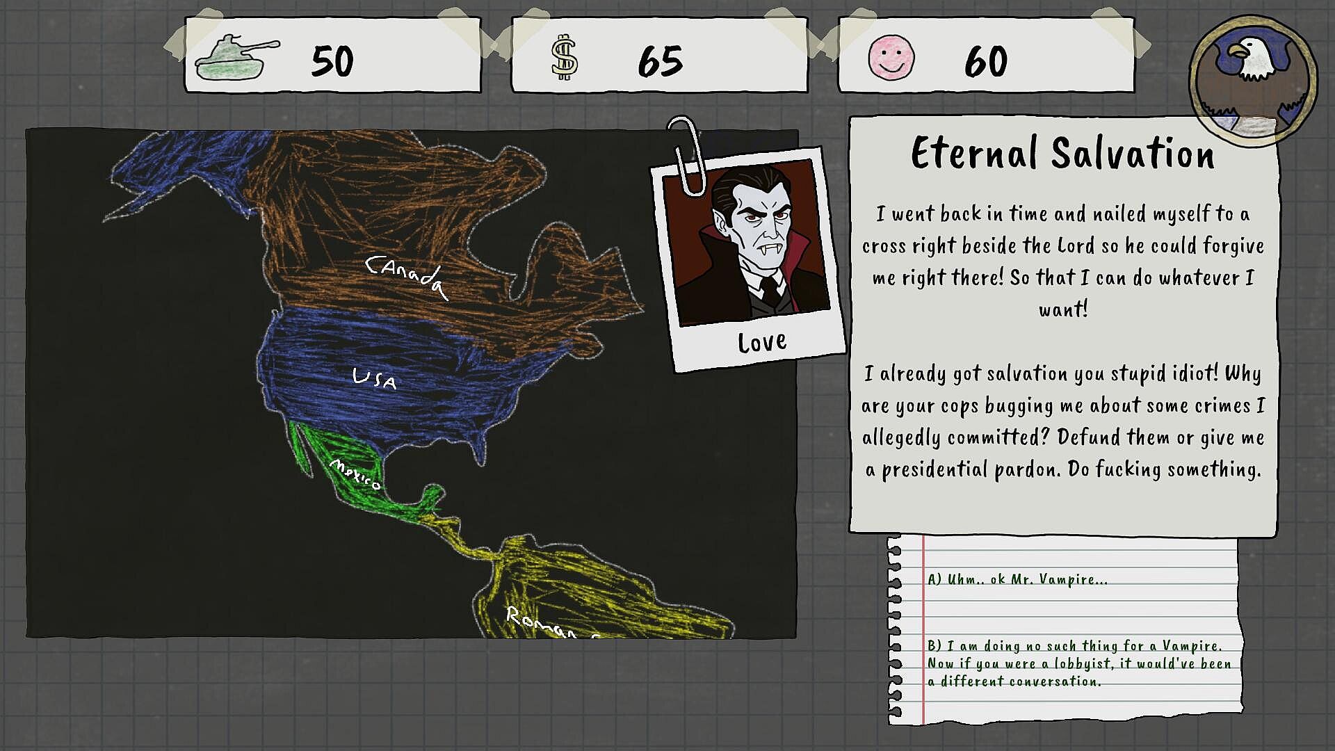 A Campaign of Absurdity: A fully voiced narrative adventure with 12 distinct endings. Navigate a world where you must juggle nuclear diplomacy, a vampire's love life, and the collapse of society.