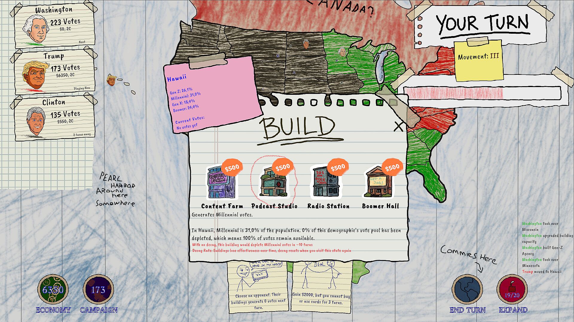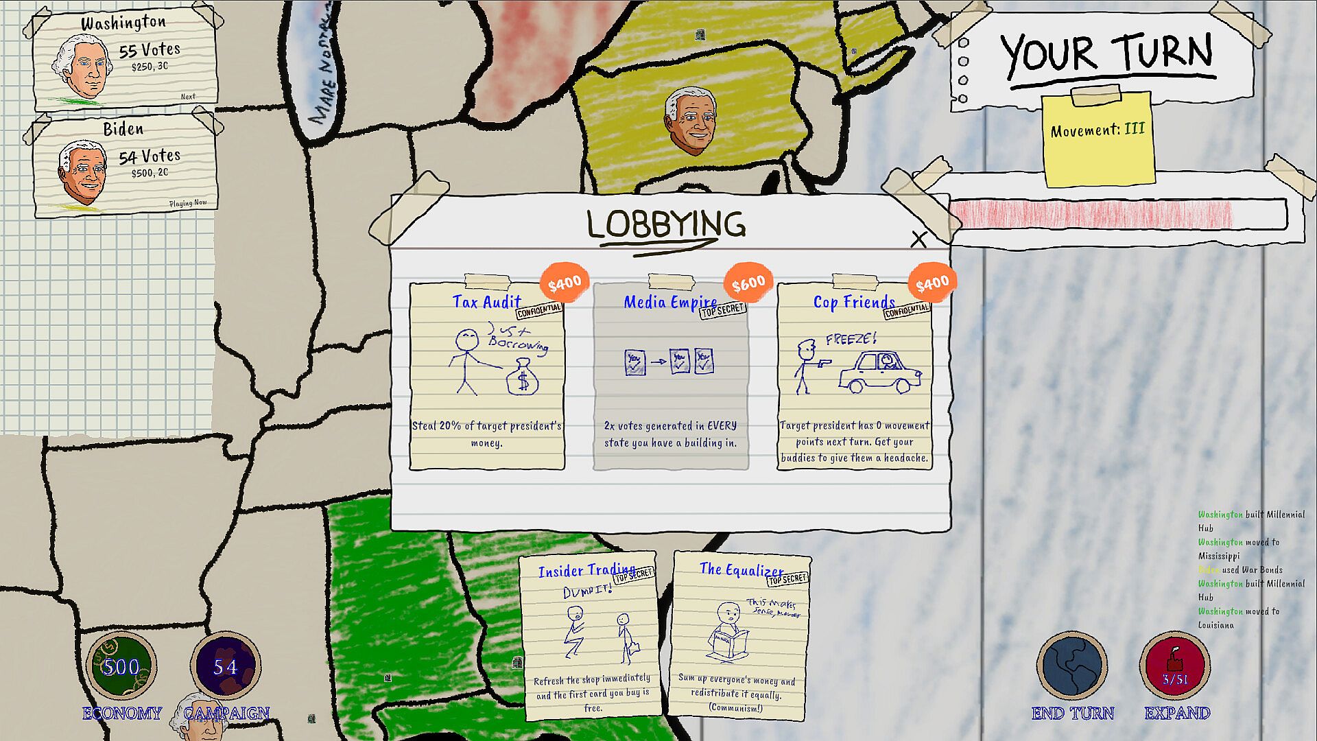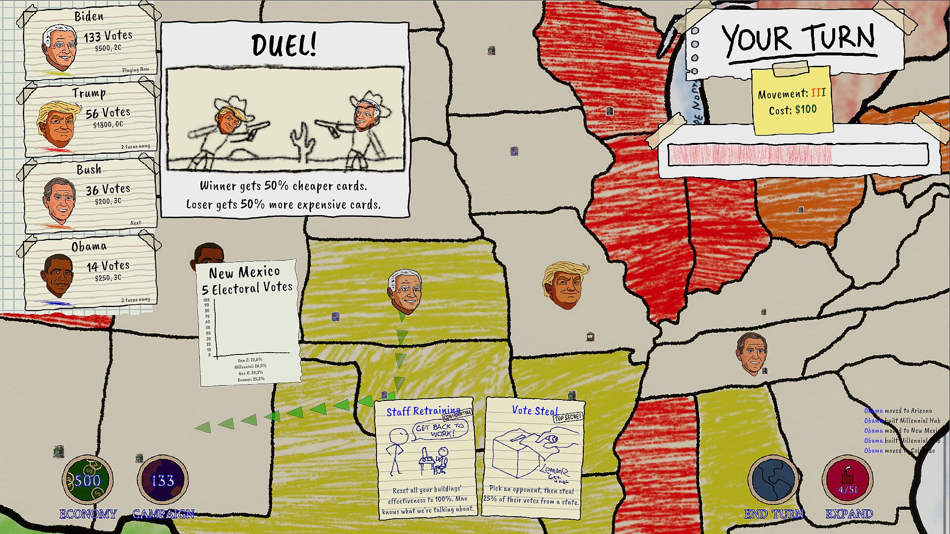 CARDS ARE AMMO: No deck-building nonsense here. You have a hand of dirty tricks. Play a "Banish" card to teleport an opponent to Alaska or a "Vote Steal" to steal their hard-earned votes.