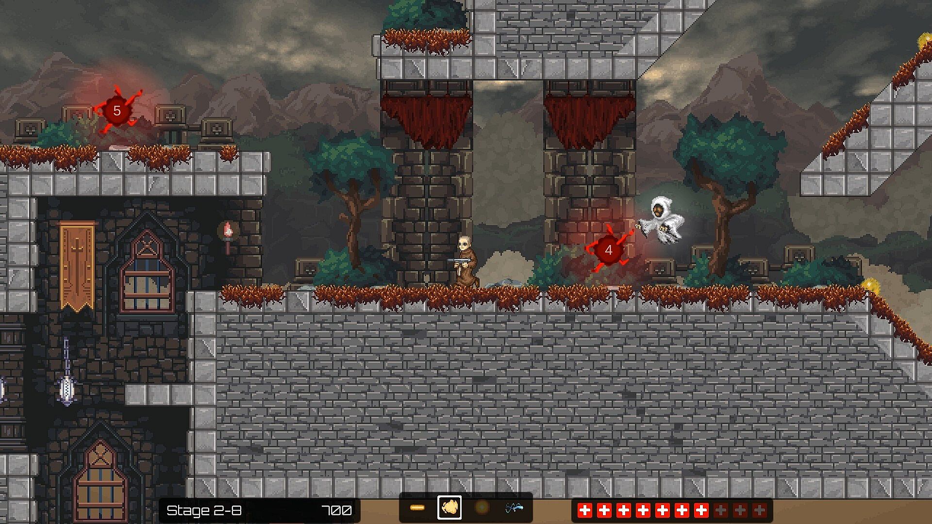 The game’s visual style is modern pixel art, optimized for 1920×1080. Clear, easy-to-read characters and projectiles.