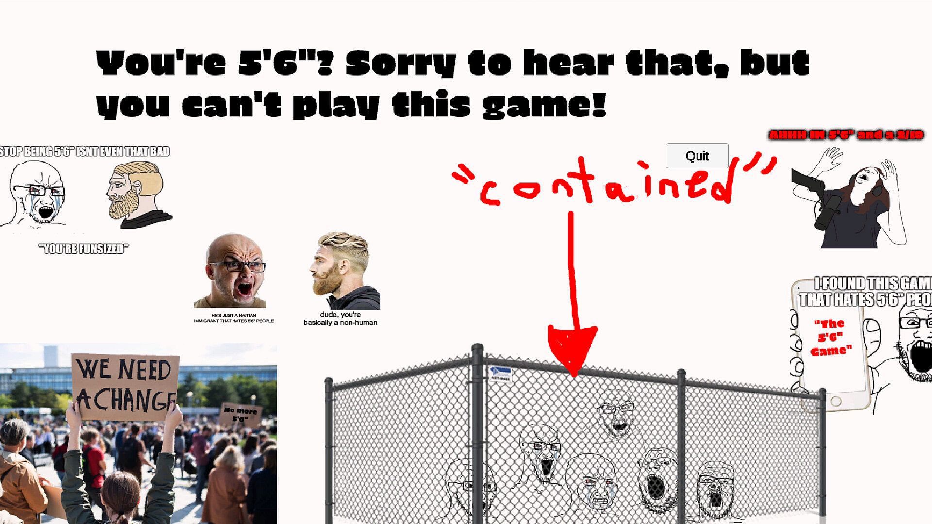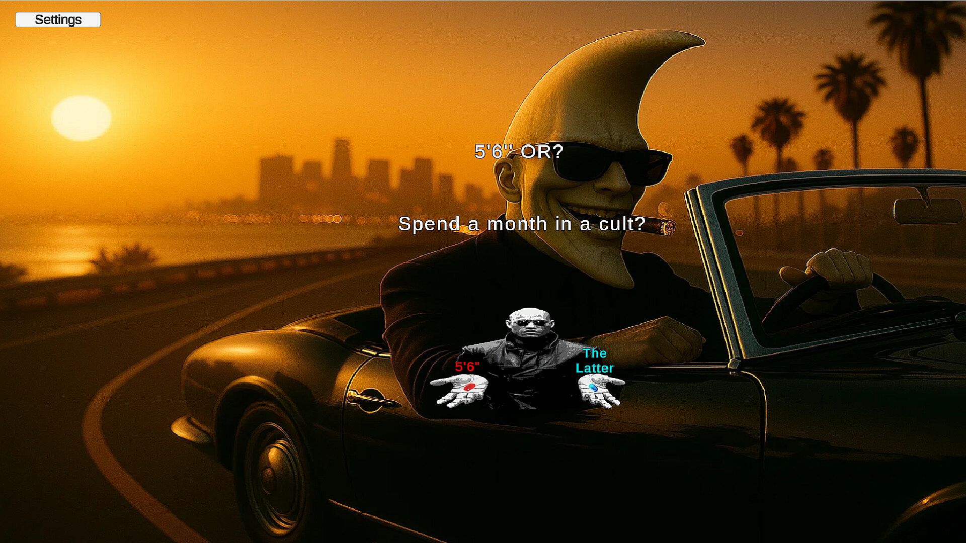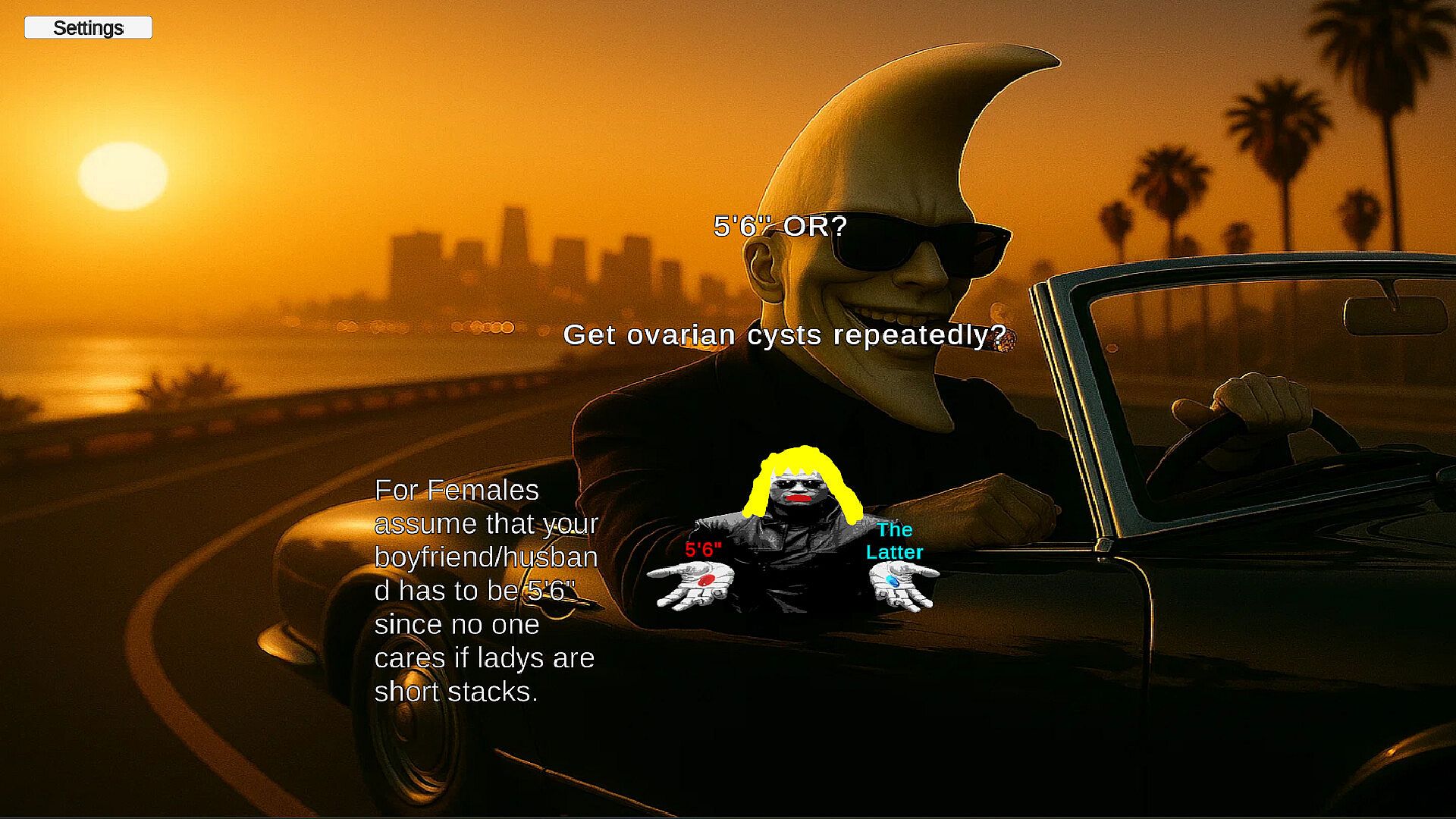 5'6" is a chaotic and hilarious “Would You Rather?”–style decision game designed around one simple concept: you’re not 5'6", and thank goodness. Every question pushes you into strange hypotheticals, absurd dilemmas, and uncomfortable choices as you navigate a world where being 5'6" is the ultimate curse.