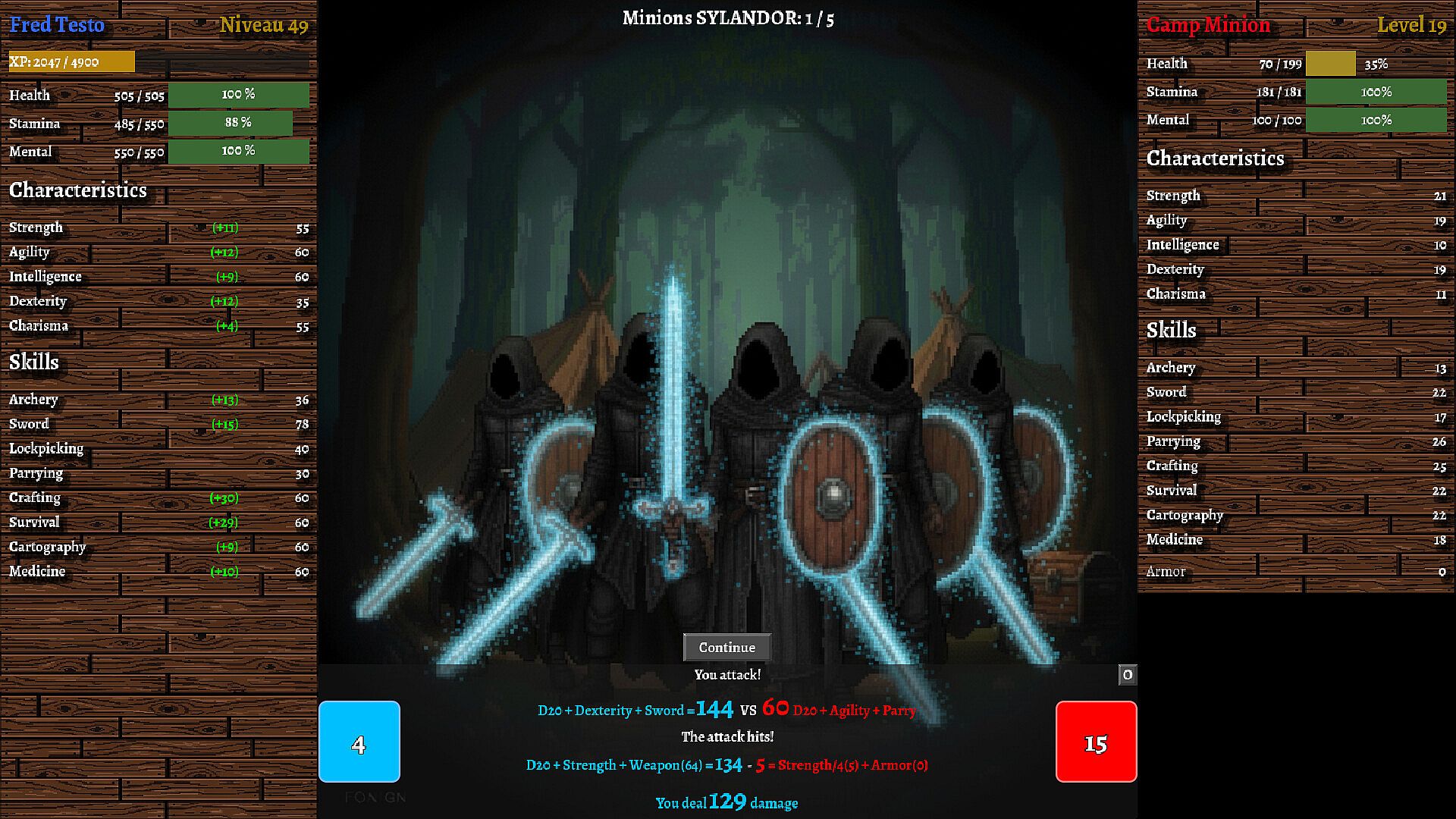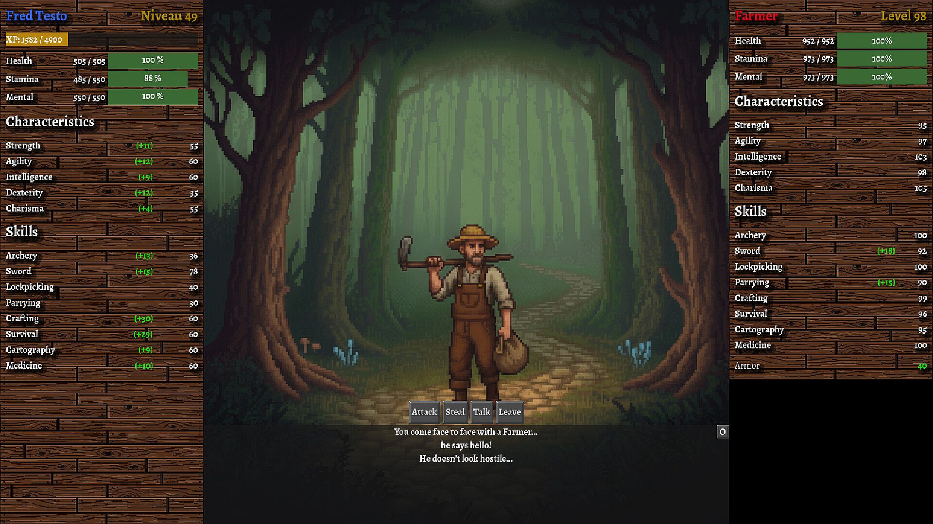 "The Adventure of Fred" is not an action game. Face bosses and hostile NPCs in demanding turn-based tactical combat. Success depends on your Initiative (Agility), your ability to Parry, and your stamina management. Clear entire bandit camps wave after wave, and defend yourself against hostile wildlife.