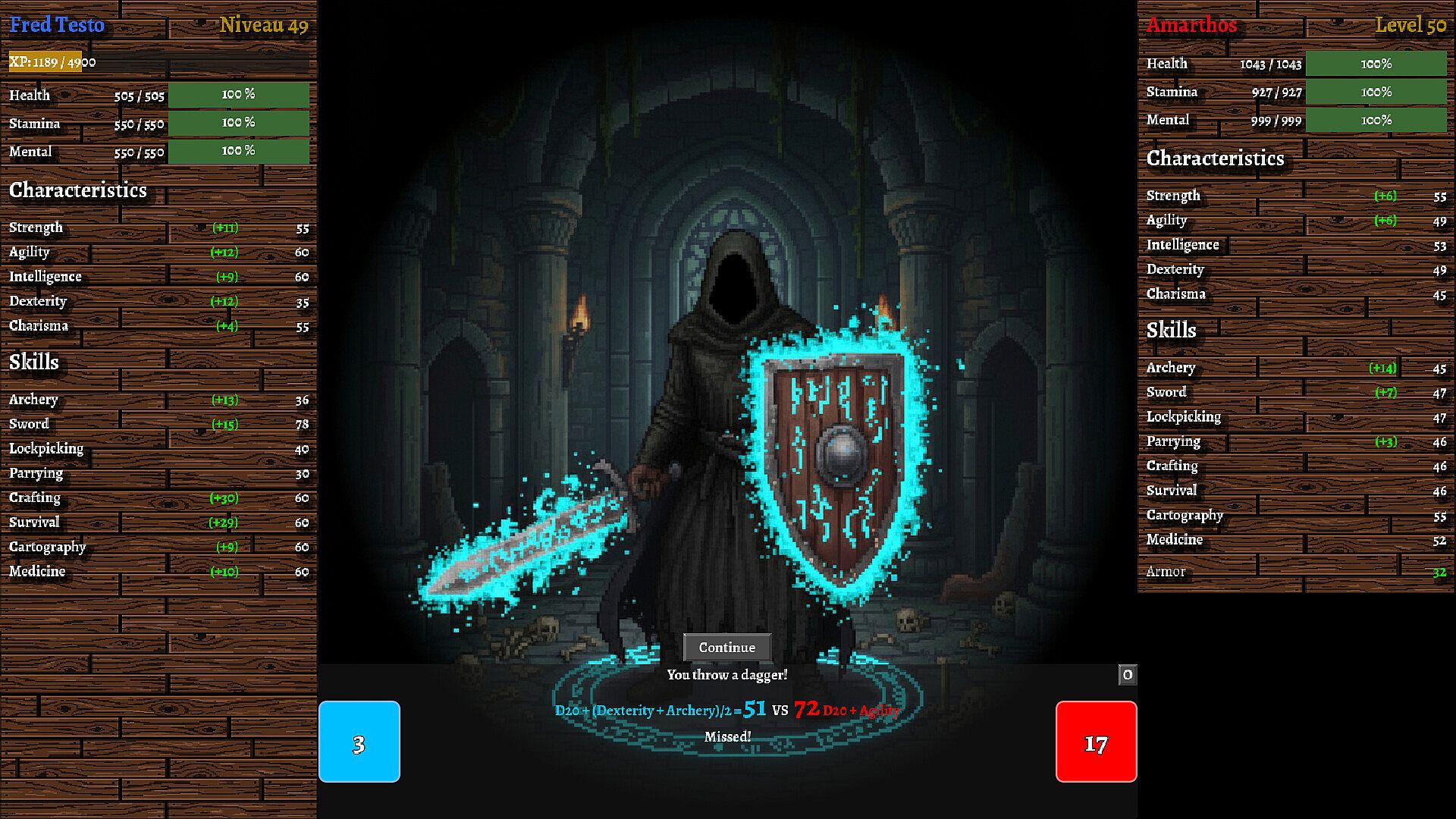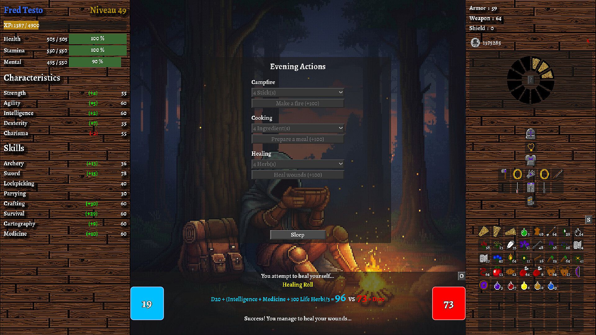 Every night, you must make camp. Manage resources gathered during the day to build a fire, cook, and heal yourself using your Survival and Medicine skills. Succeed, and a "Perfect Rest" will boost your stats the next day. Fail, and starvation awaits. Survival is not a punishment; it is a strategy.