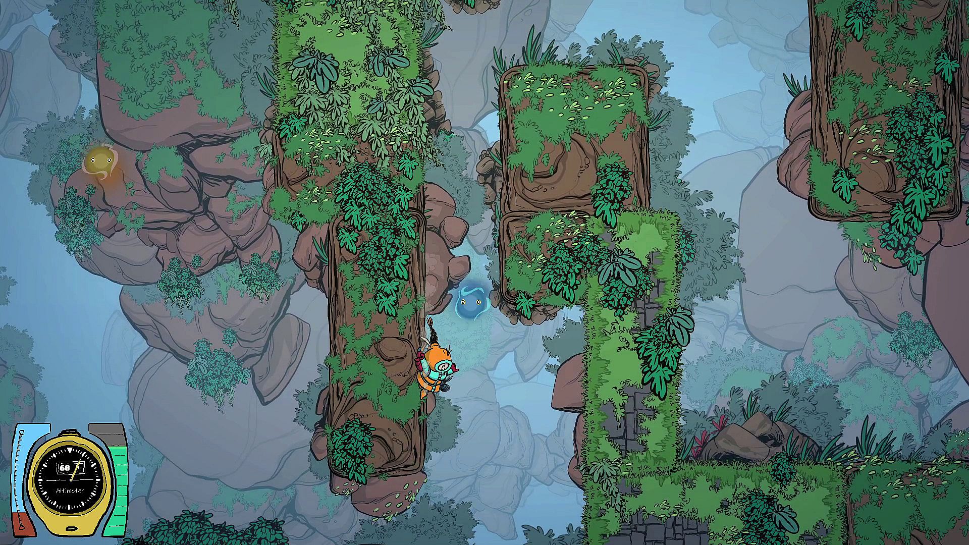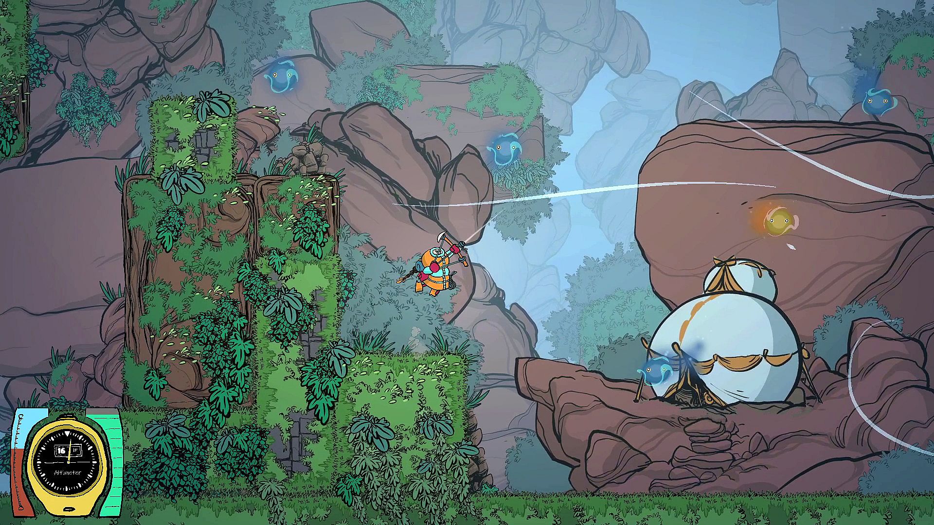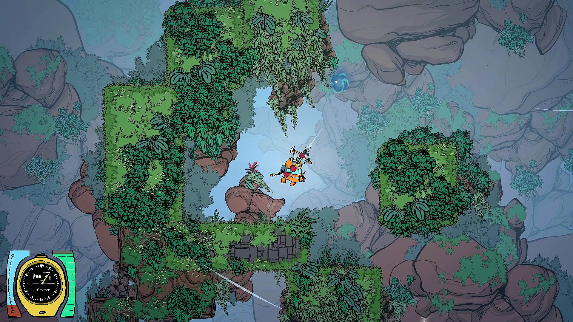 Use an ice Axe to climb walls, and a grappling hook to twirl in all directions. Small creatures can be used as hooking points. Choose carefully wich one you aim, as they all have different purposes.