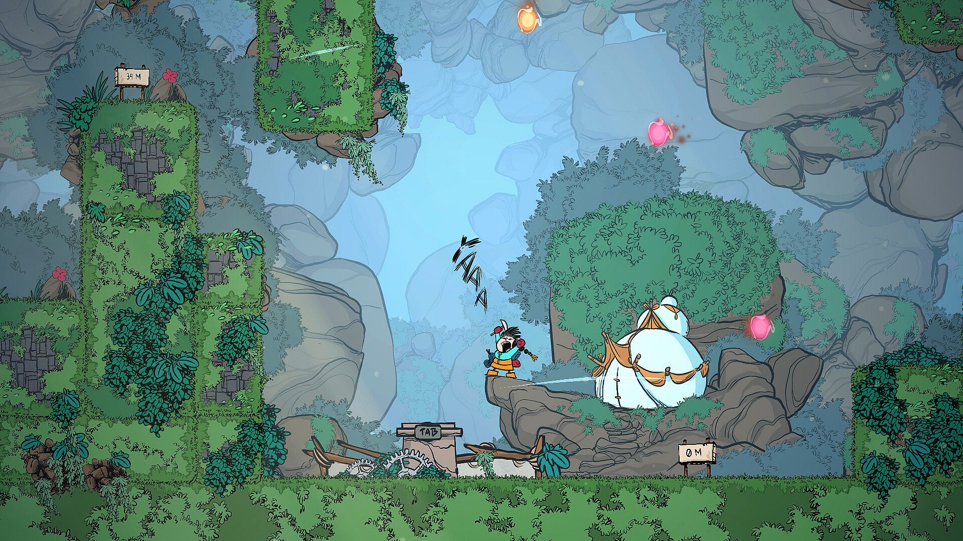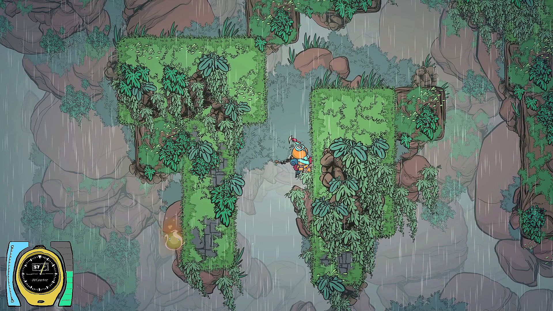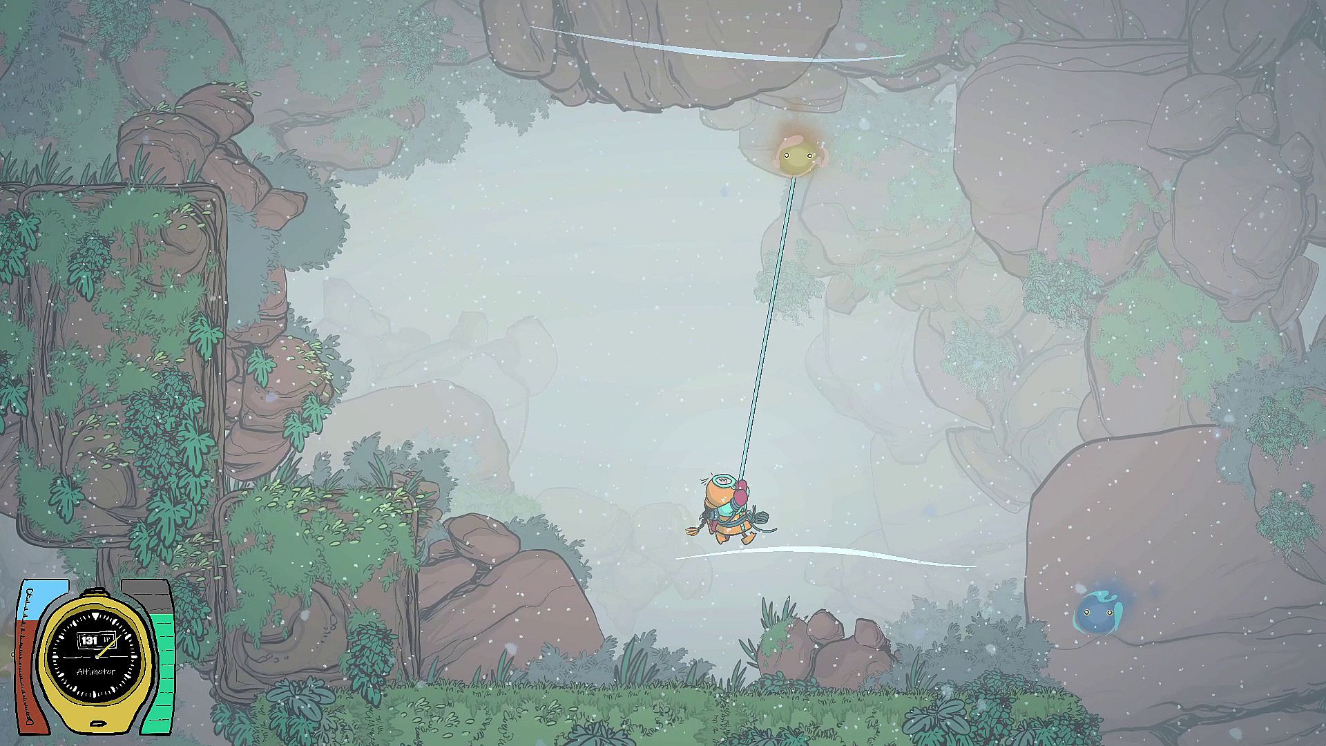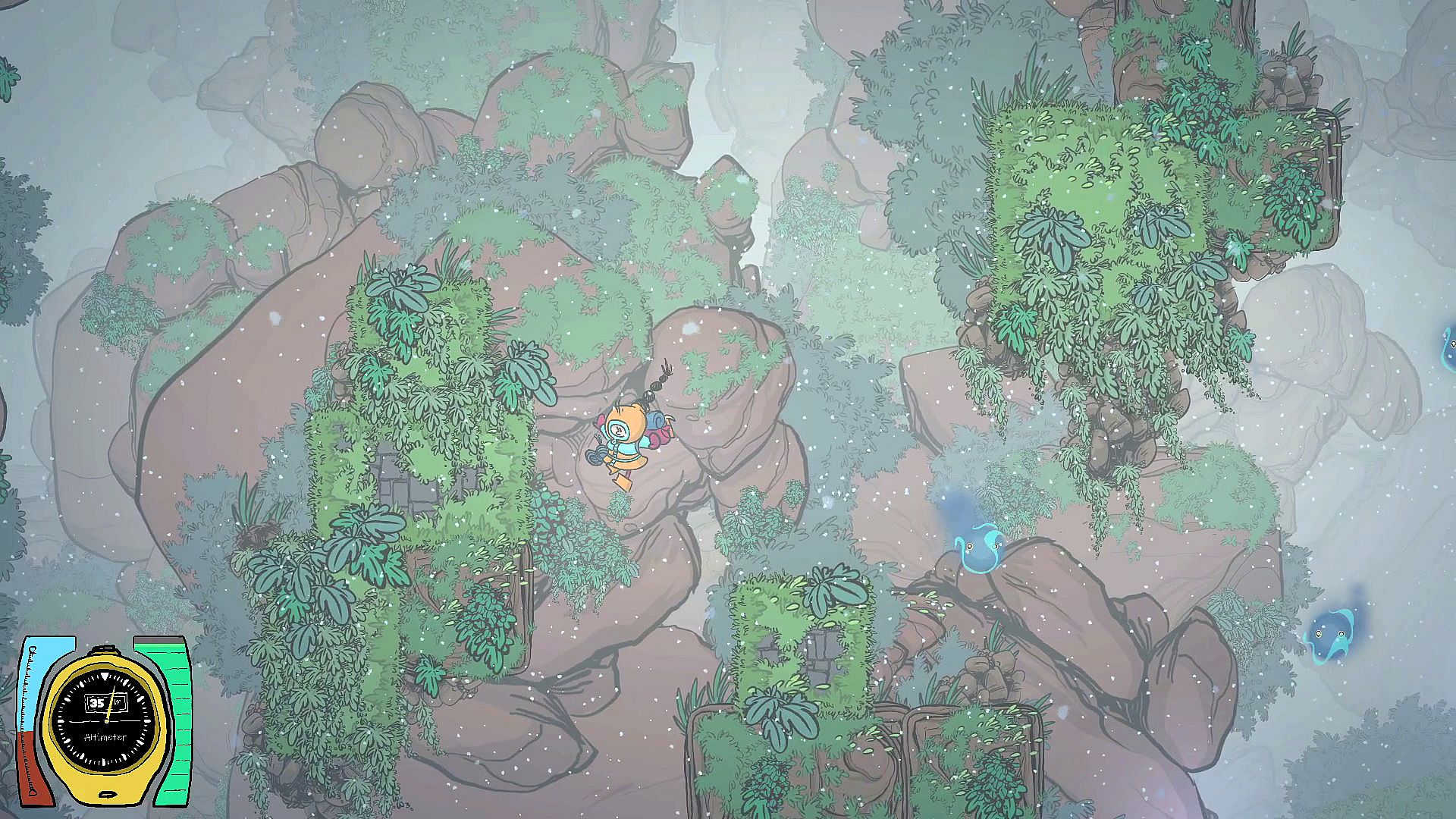 Use an ice Axe to climb walls, and a grappling hook to twirl in all directions. Small creatures can be used as hooking points. Choose carefully wich one you aim, as they all have different purposes.