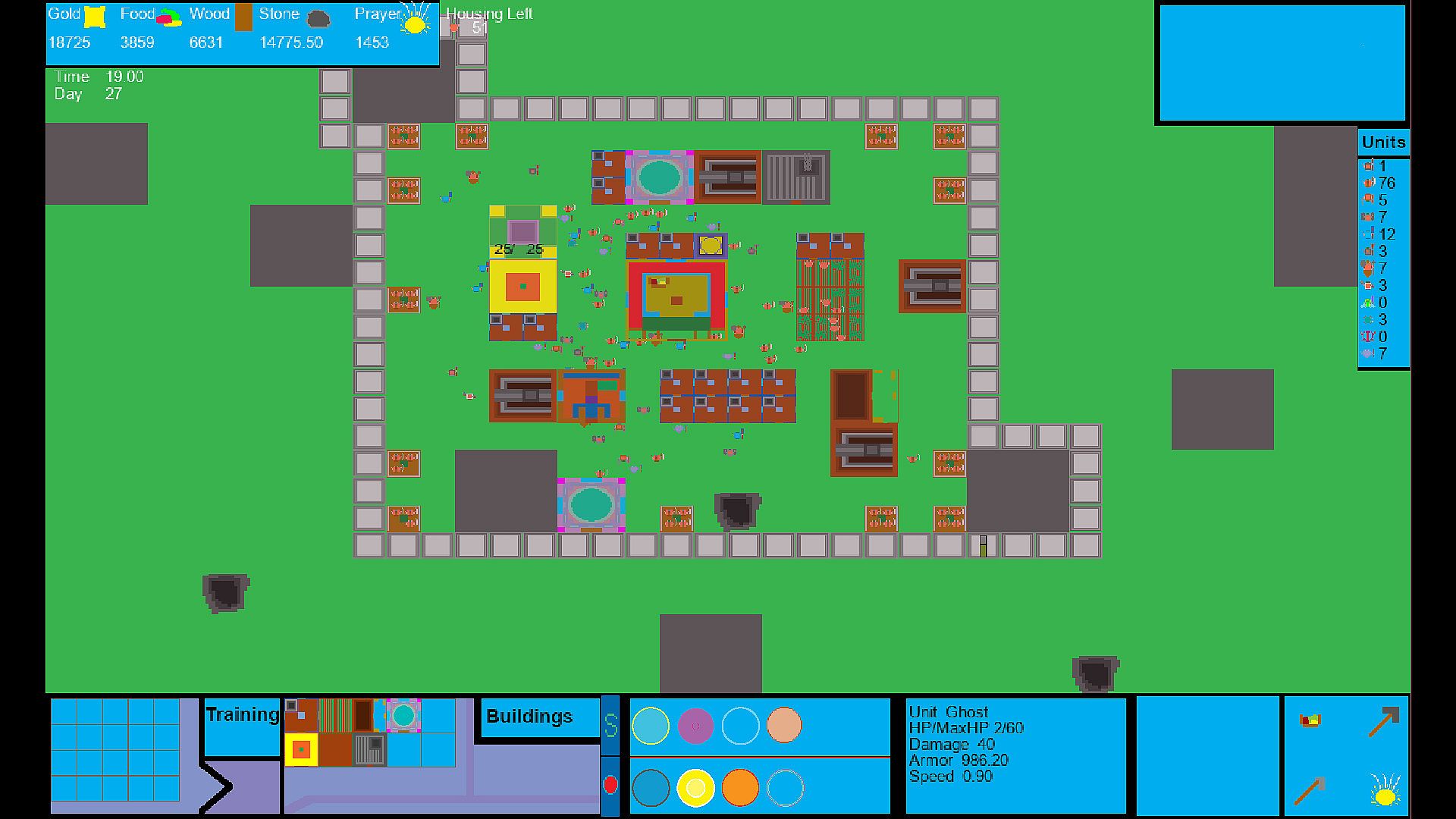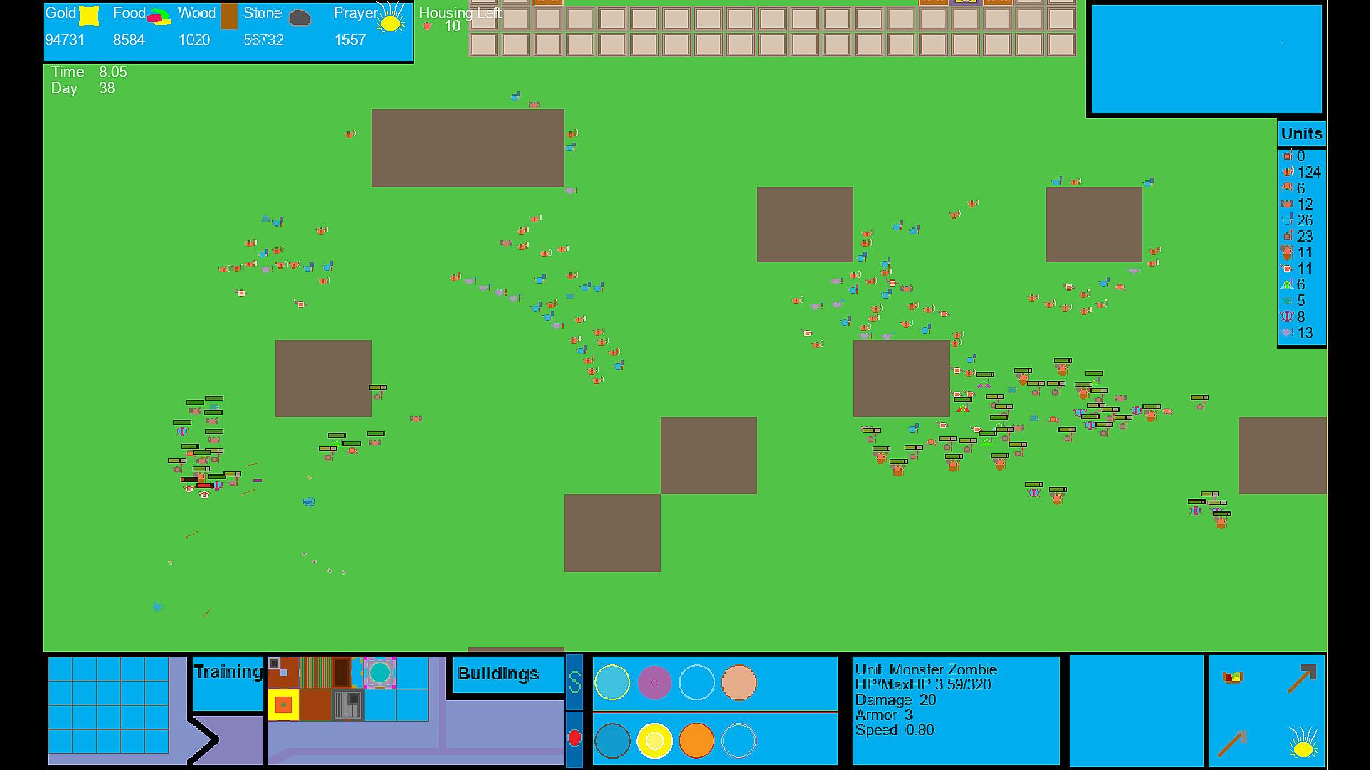 Your people must eat to survive. You can harvest from berry bushes and from built farms for food. Have your people mine from stone deposits for stone and gold to keep your economy going as well as harvest trees for a source of wood. During all this time; defend from waves of monsters that threaten your village's existence.Base Building