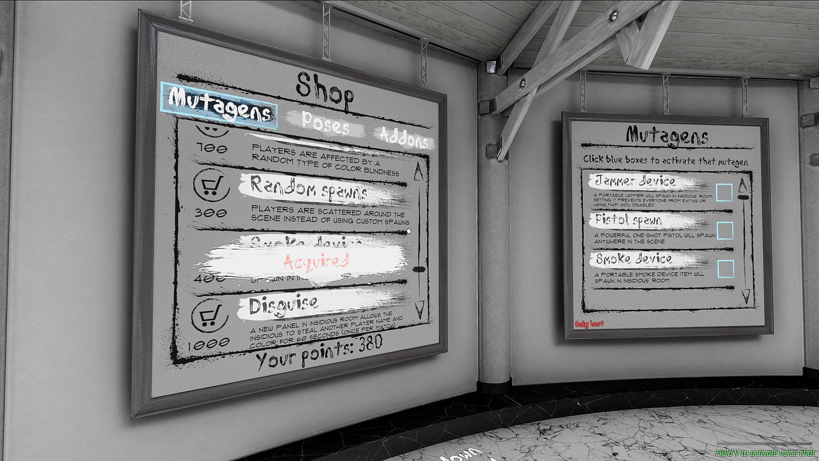Mutagens moderately alter the way the game is played. Acquire them at the shop and let the host activate them for different effects: gun spawn, smoke devices, jammers, disguises, etc.