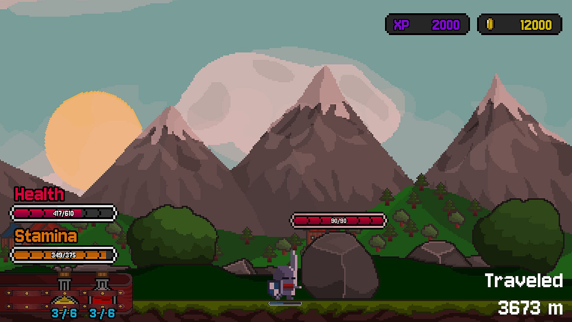 Watch your health and stamina — if either drops to zero, your adventure ends and you return to town with your earnings.
