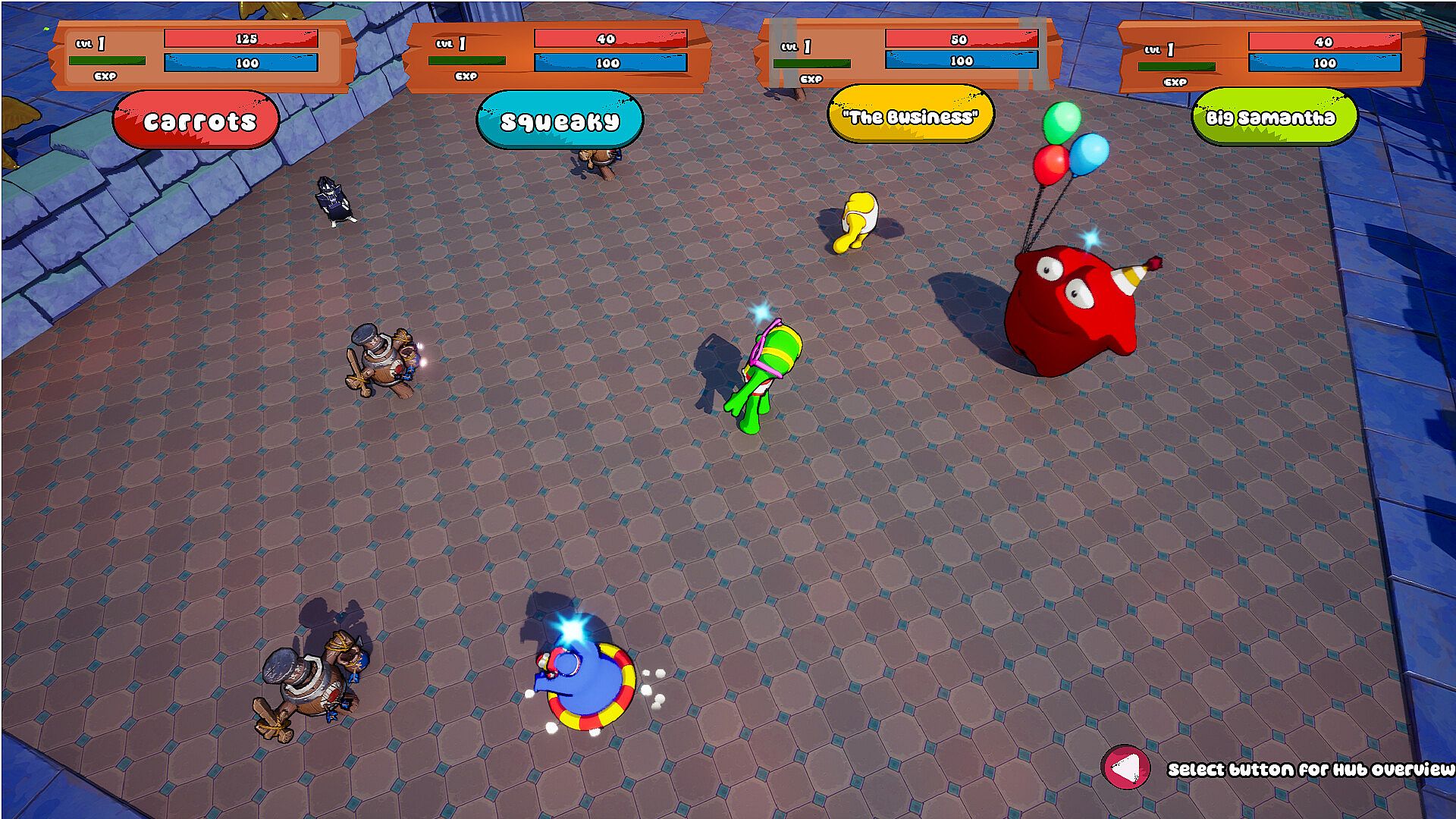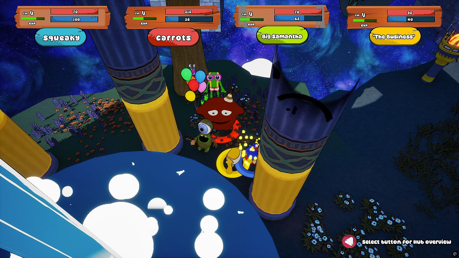 With up to four friends online, play as one of four classic archetypes, each with their own unique playstyle. Whether you prefer tanking for the party behind your behemoth tongue as Carrots, dishing out “splash” damage as Squeaky , throwing hands as "The Business", or rock-chucking from afar as Big Samantha, every adventure will be a bigger, badder party than the last...