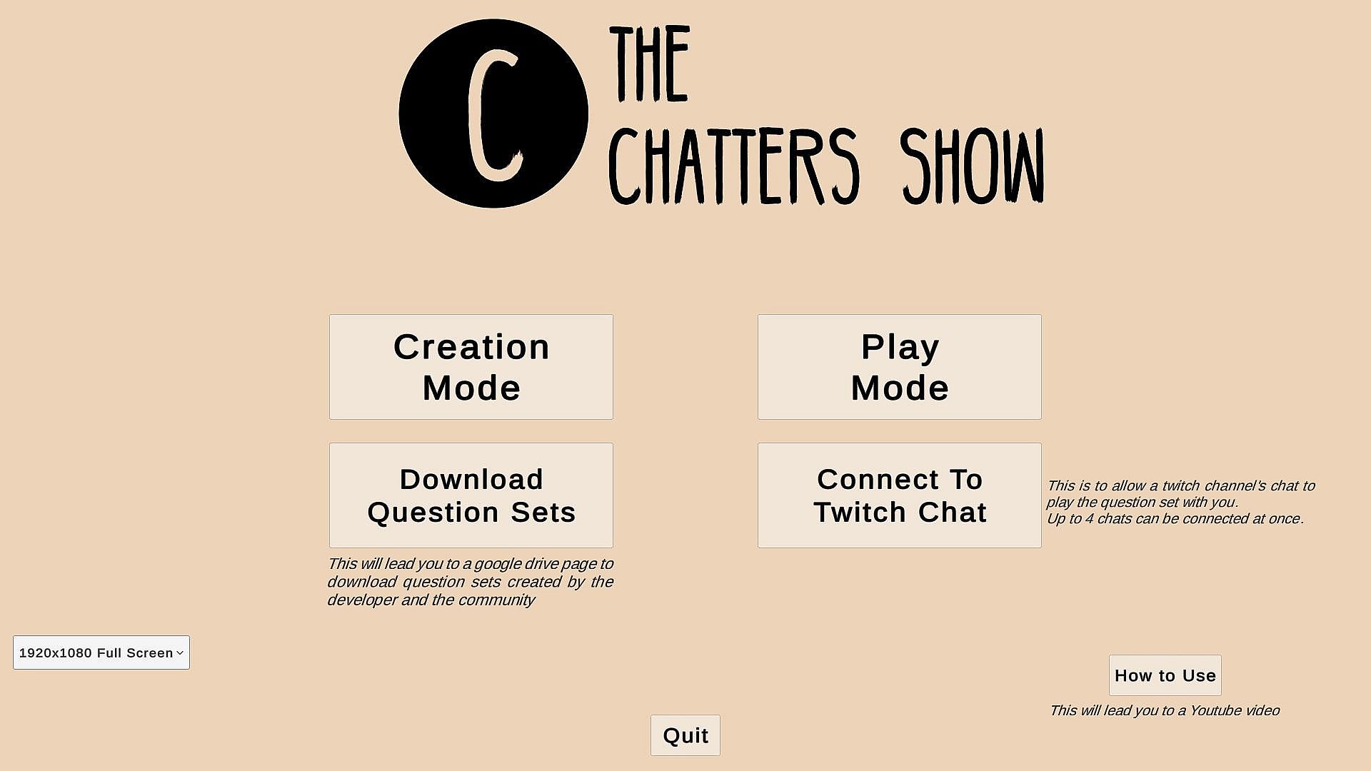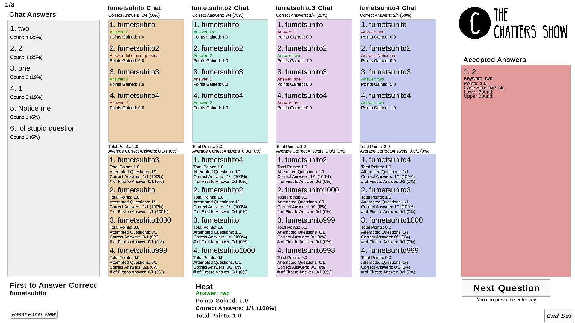 The Chatters Show is designed for Twitch streamers and their chats. Create questions sets and play with your chat to see who is the smartest person.