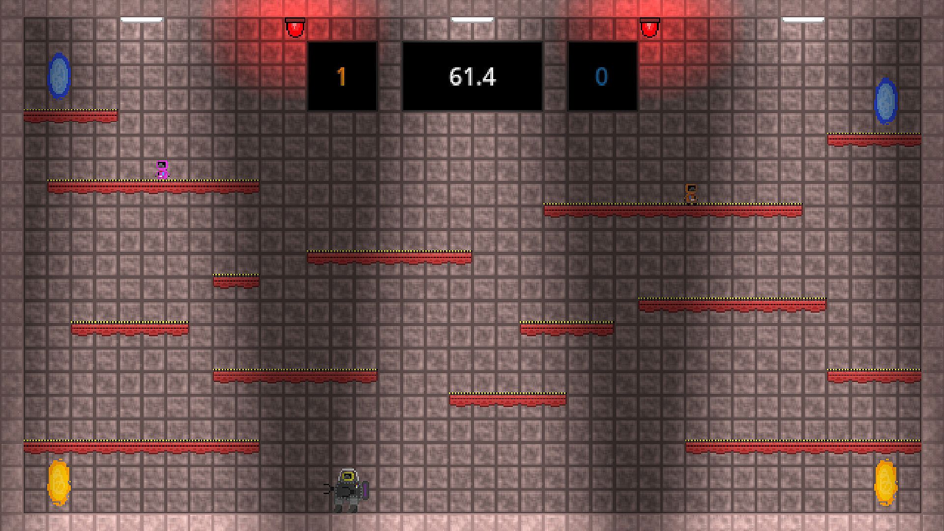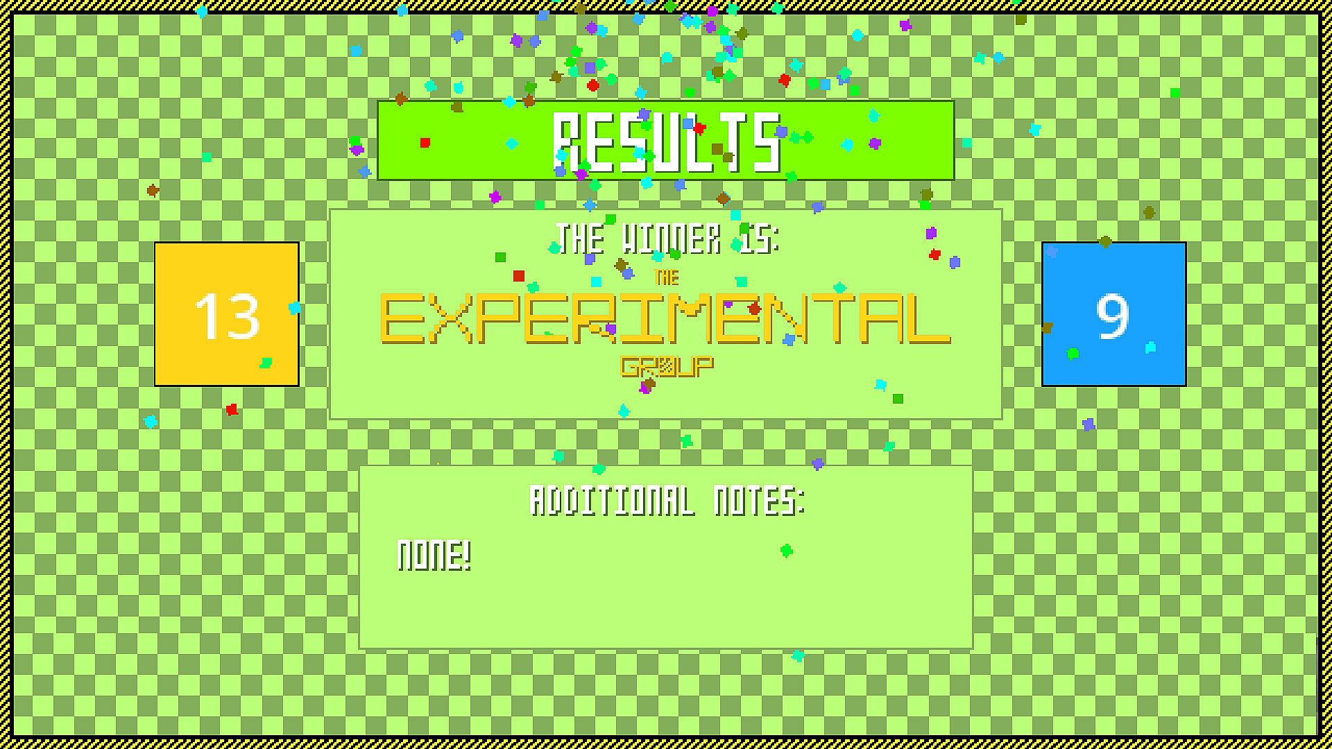Each round, a random unique minigame is chosen and up to four players (four players recommended) are randomly split into the Control Group (up to three players) and the Experimental Group (one player). Modifiers are given to all of the players to make the game more interesting! The Experimental Group, being only one player, has the power to pick their own modifier to best defeat the Control Group in the minigame- all the while The Control Group must fight to win against the Experimental Group. Each minigame lasts 90 seconds.