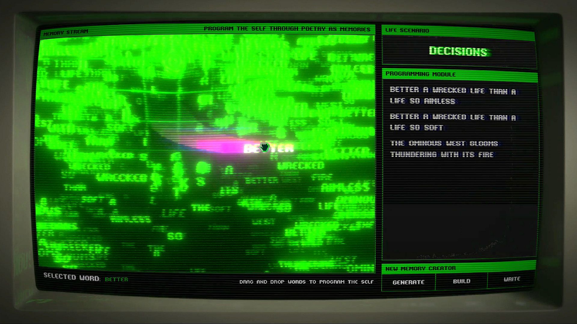 A love letter to 80s and 90s retro computing. A game that intersects poetry, programming, computers, love, death, freedom and living. Create a new self, program its memories, and destroy memory monsters created from those memories.