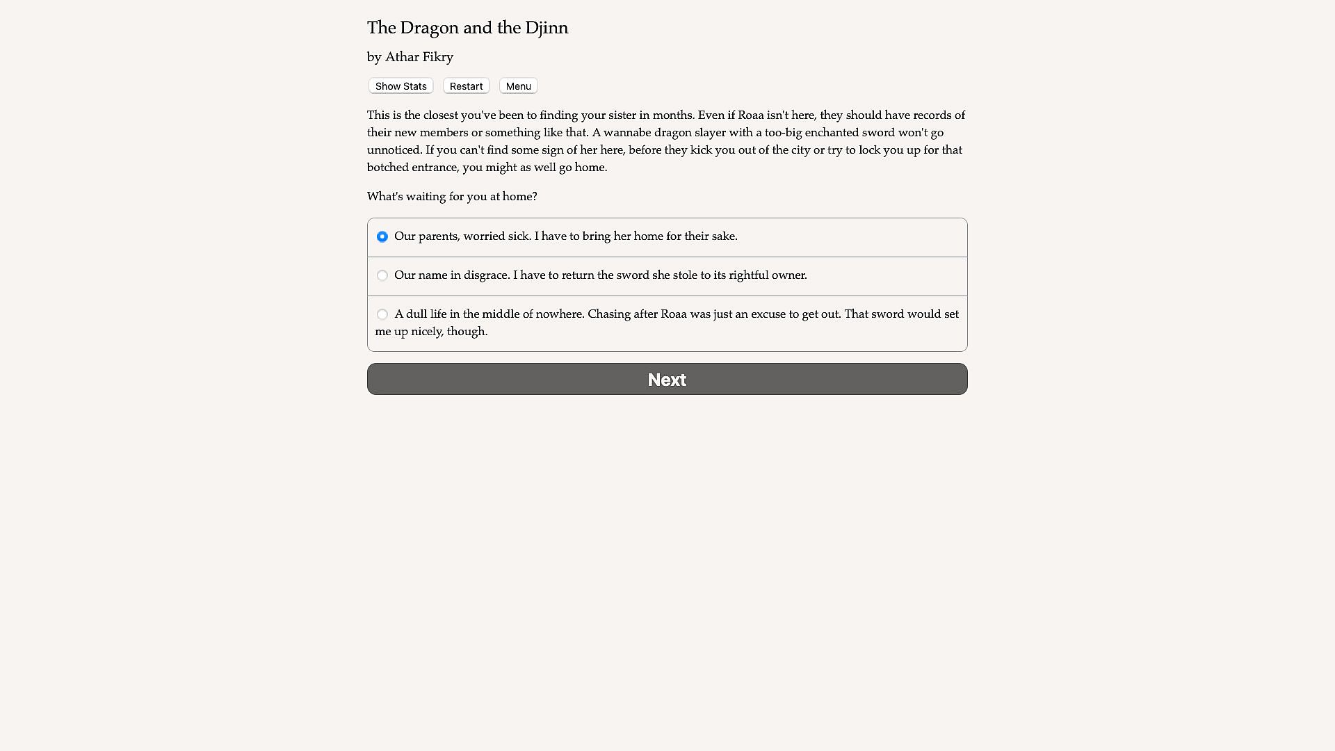The Dragon and the Djinn is a 710,000 word interactive Arab epic fantasy novel by Athar Fikry, where your choices control the story. It's entirely text-based—without graphics or sound effects—and fueled by the vast, unstoppable power of your imagination.