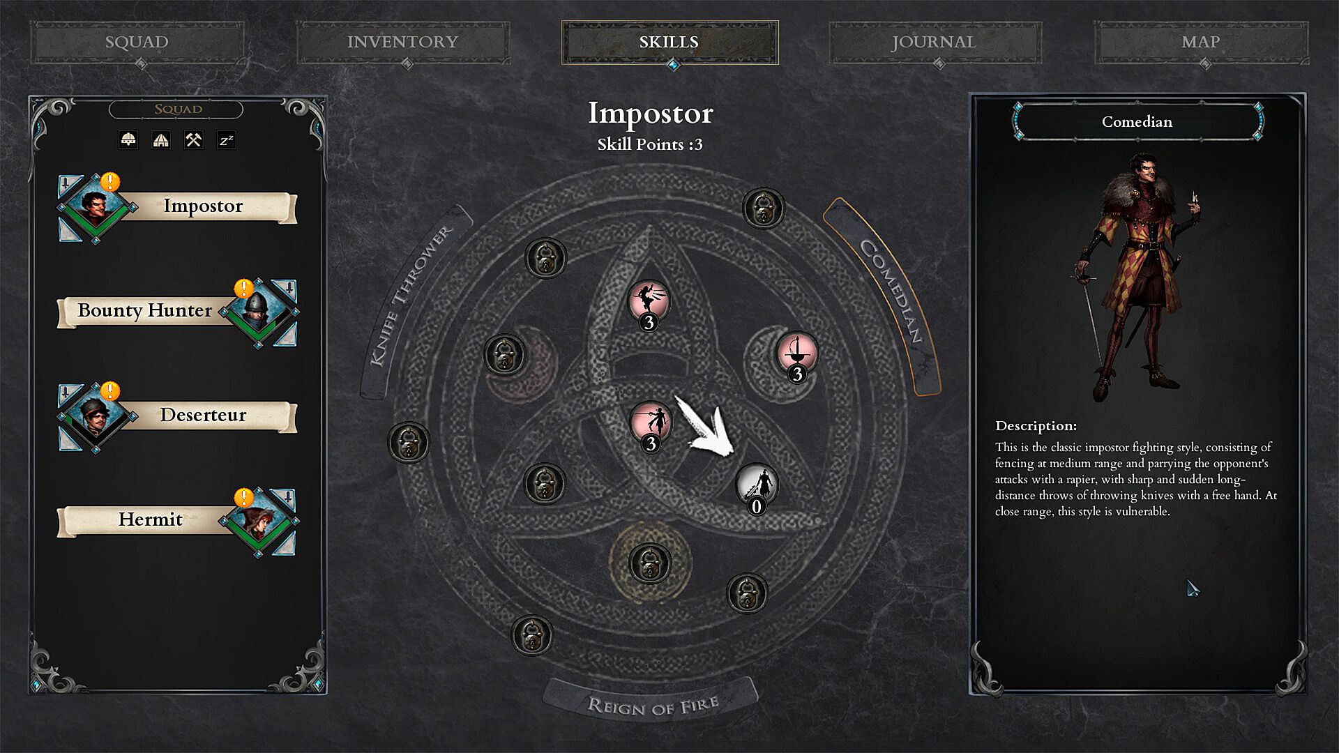 A braggart who often pretends to be someone he's not - for fun or for a gold coin. He is the leader of this peculiar squad, but no one really knows his biography. The impostor's appearance is bright and memorable, as well as his Italian accent. His weapon is a rapier or its flamberge version. He also uses throwing knives or incendiary mixture to achieve the best results in battle.Deserteur