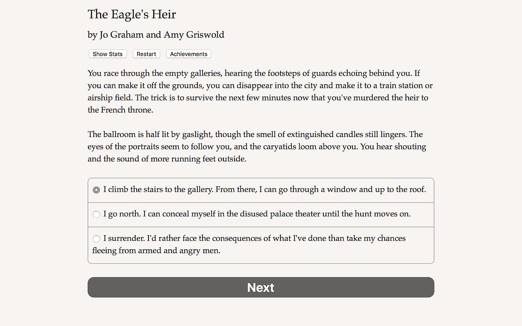The Eagle's Heir is a 200,000 word interactive novel by Amy Griswold and Jo Graham. It's entirely text-based, without graphics, or sound effects, and fueled by the vast, unstoppable power of your imagination.