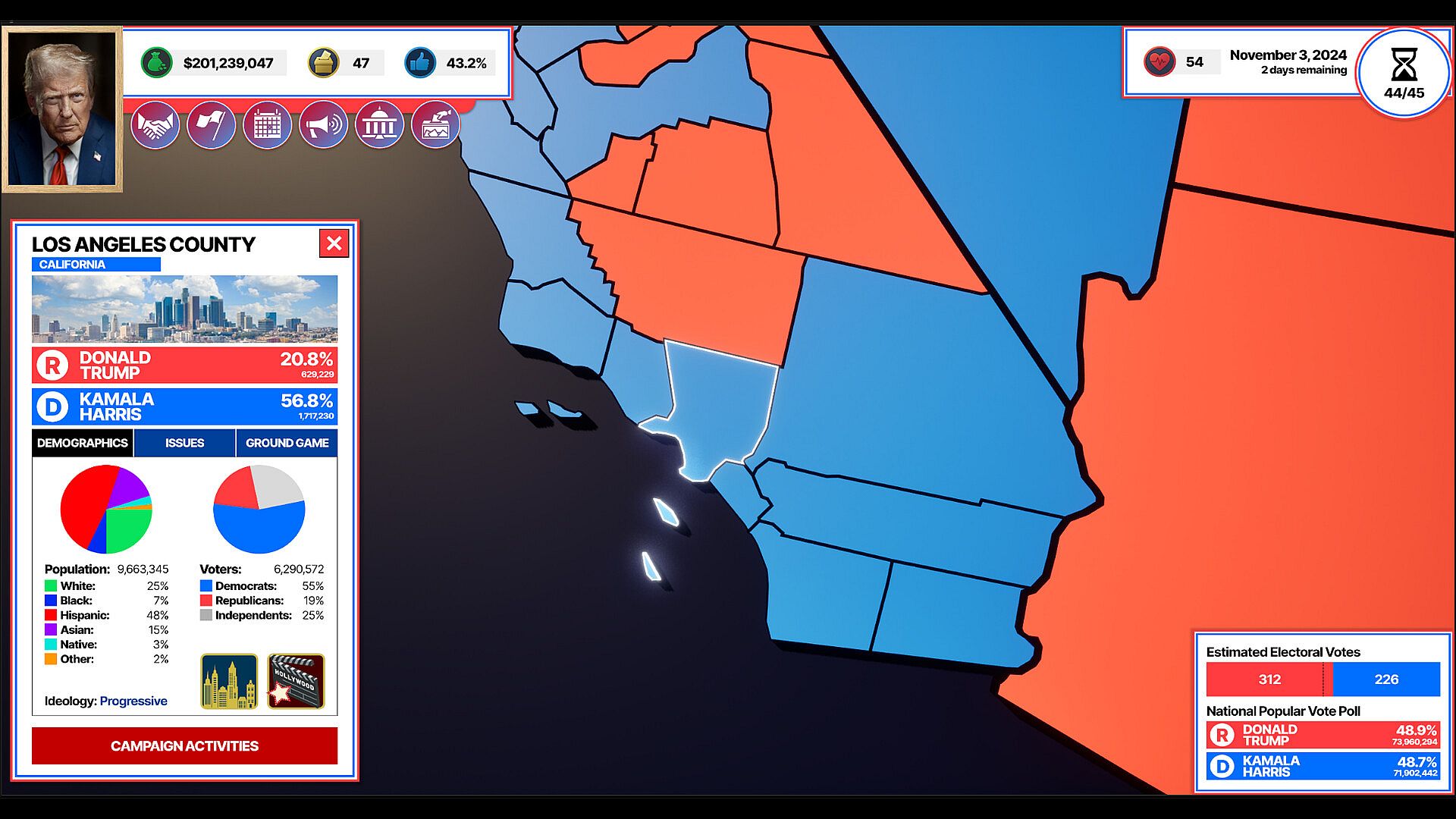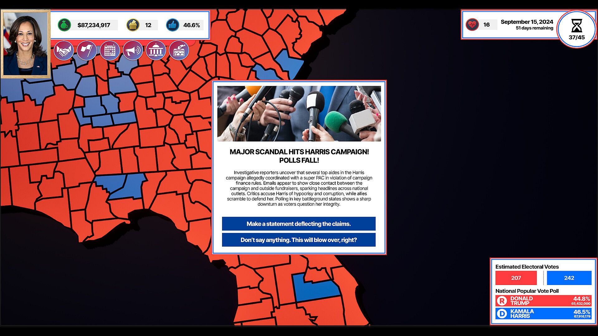 Plan your weekly moves and adapt to new conditions. Open field offices, build volunteer networks, buy advertisements, hire staff, and schedule events in any county and state you see fit. But don't run out of money!