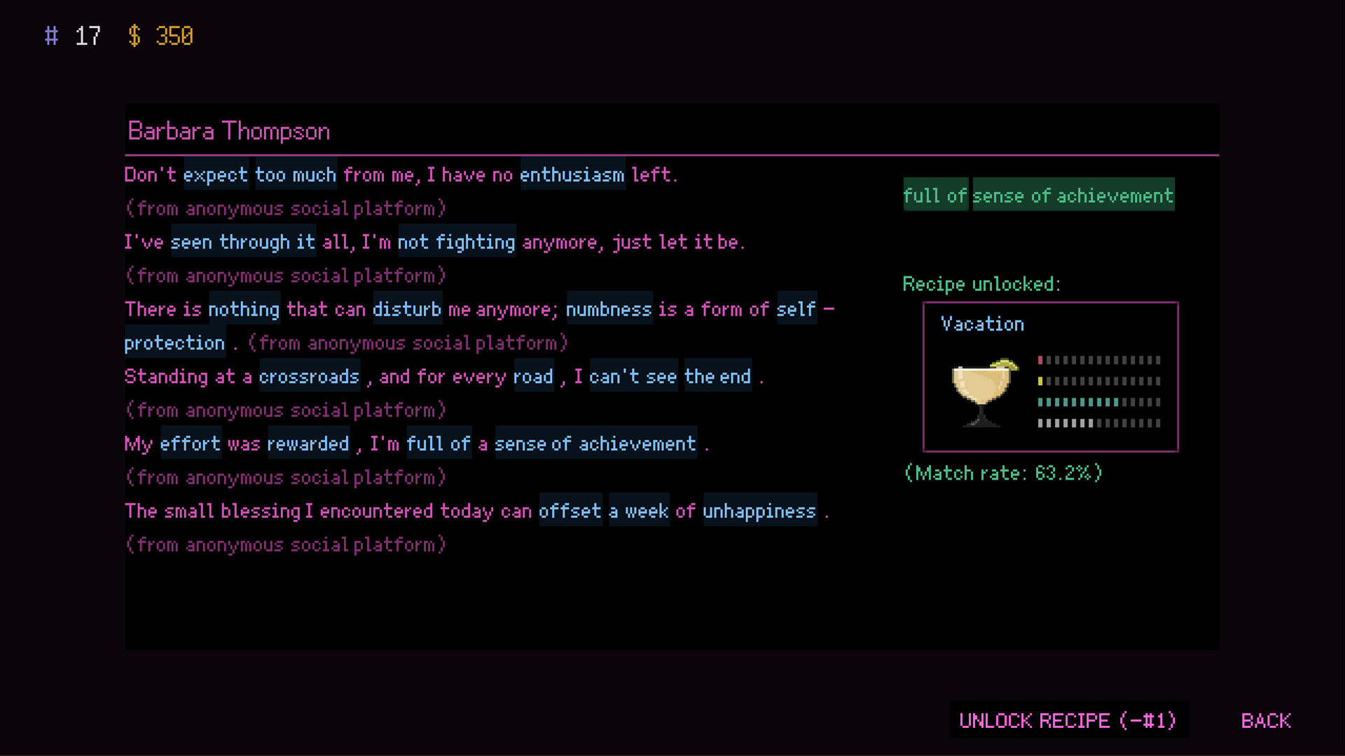 Successfully understanding and satisfying a customer's emotional needs won't just improve your "empathy match rate." It will also unlock new drink recipes, deepen your understanding of more customers' life paths, and gradually reveal the urban legends hidden within this pixelated world.
