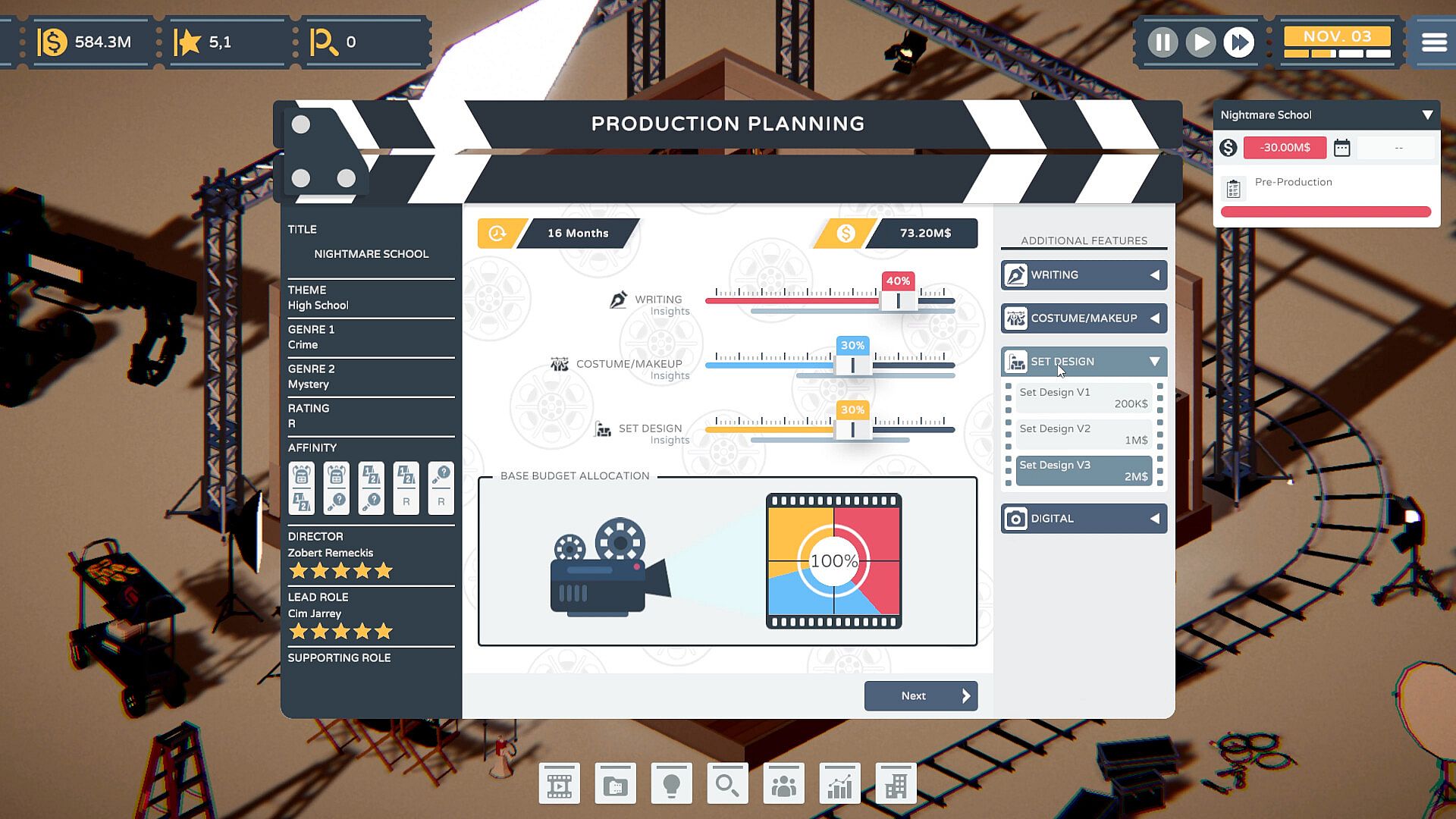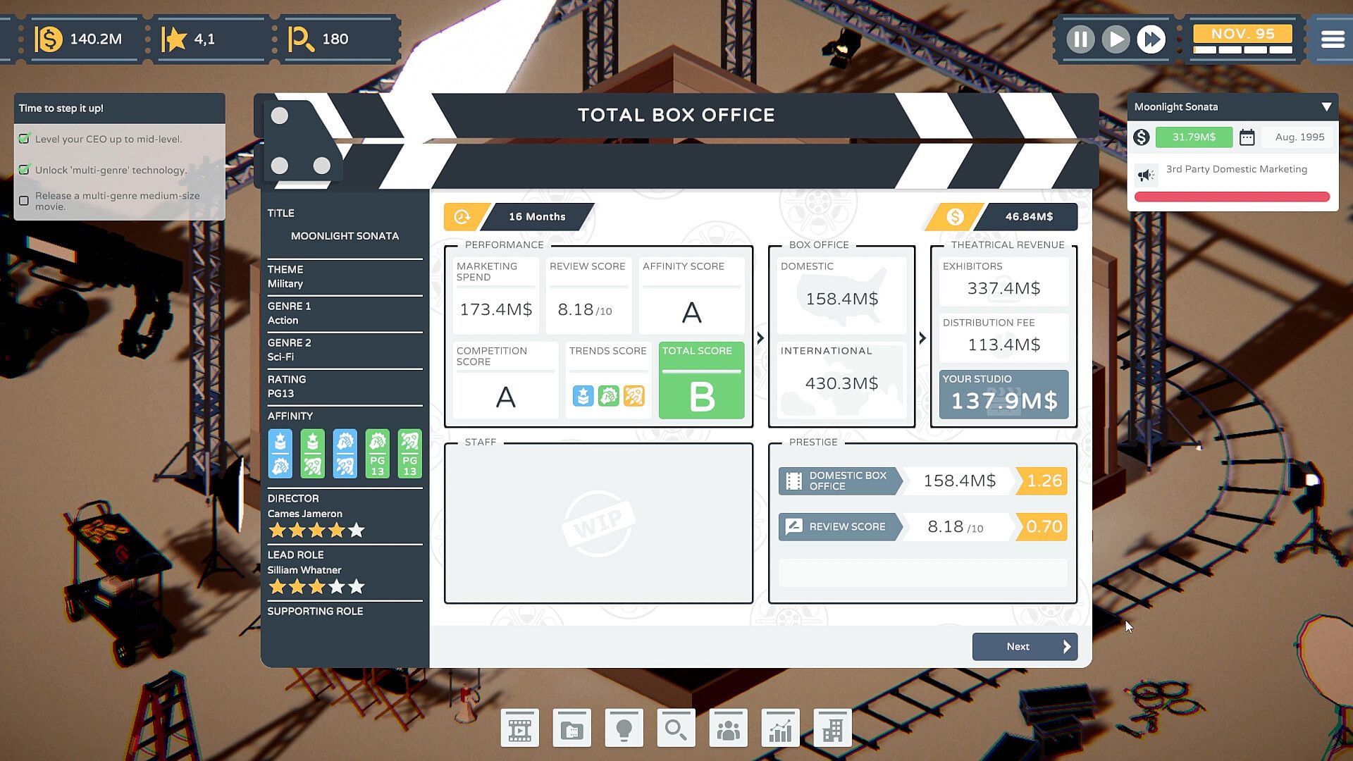 Bring your cinematic visions to life. Choose themes, genres, and target ratings to shape your creations. Dive deep into screenplay development, cast the hottest stars (or discover hidden talent), and allocate your budget wisely to make each film shine. Every decision impacts your movie’s critical acclaim and box office potential, so craft your masterpieces with care.