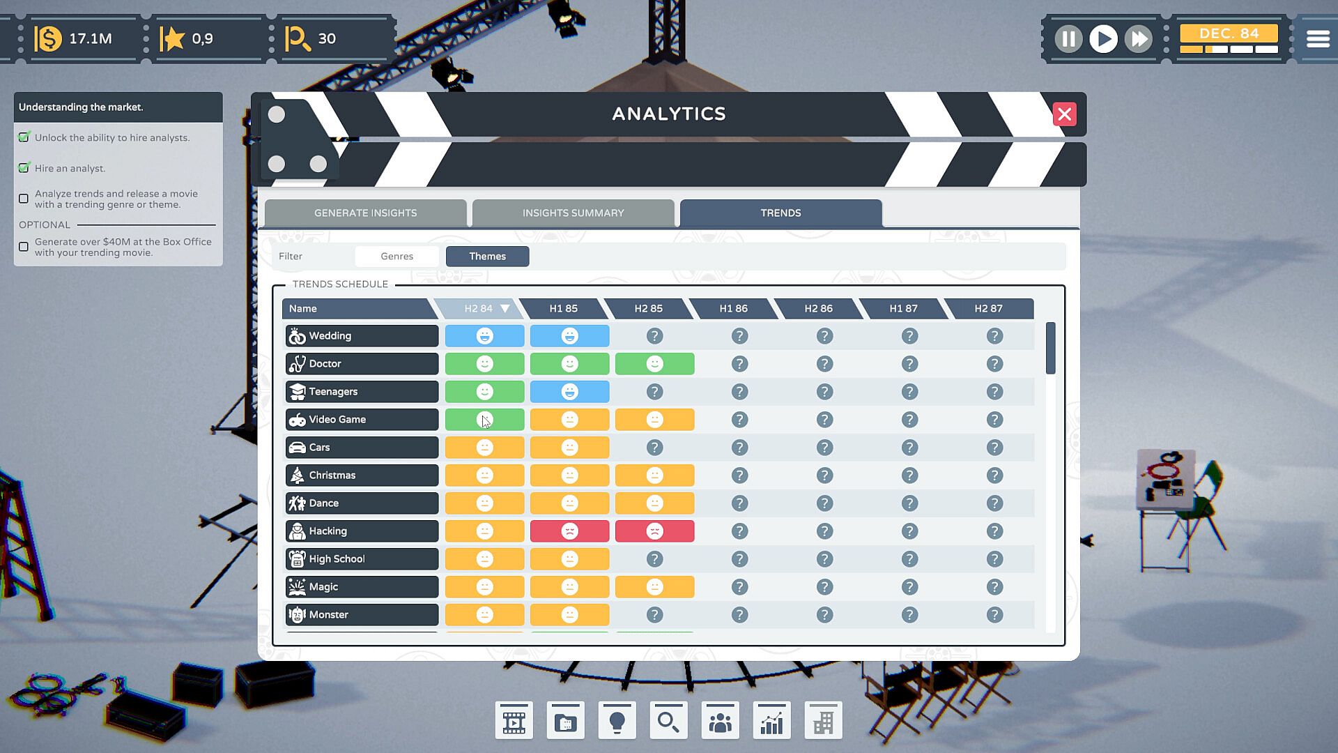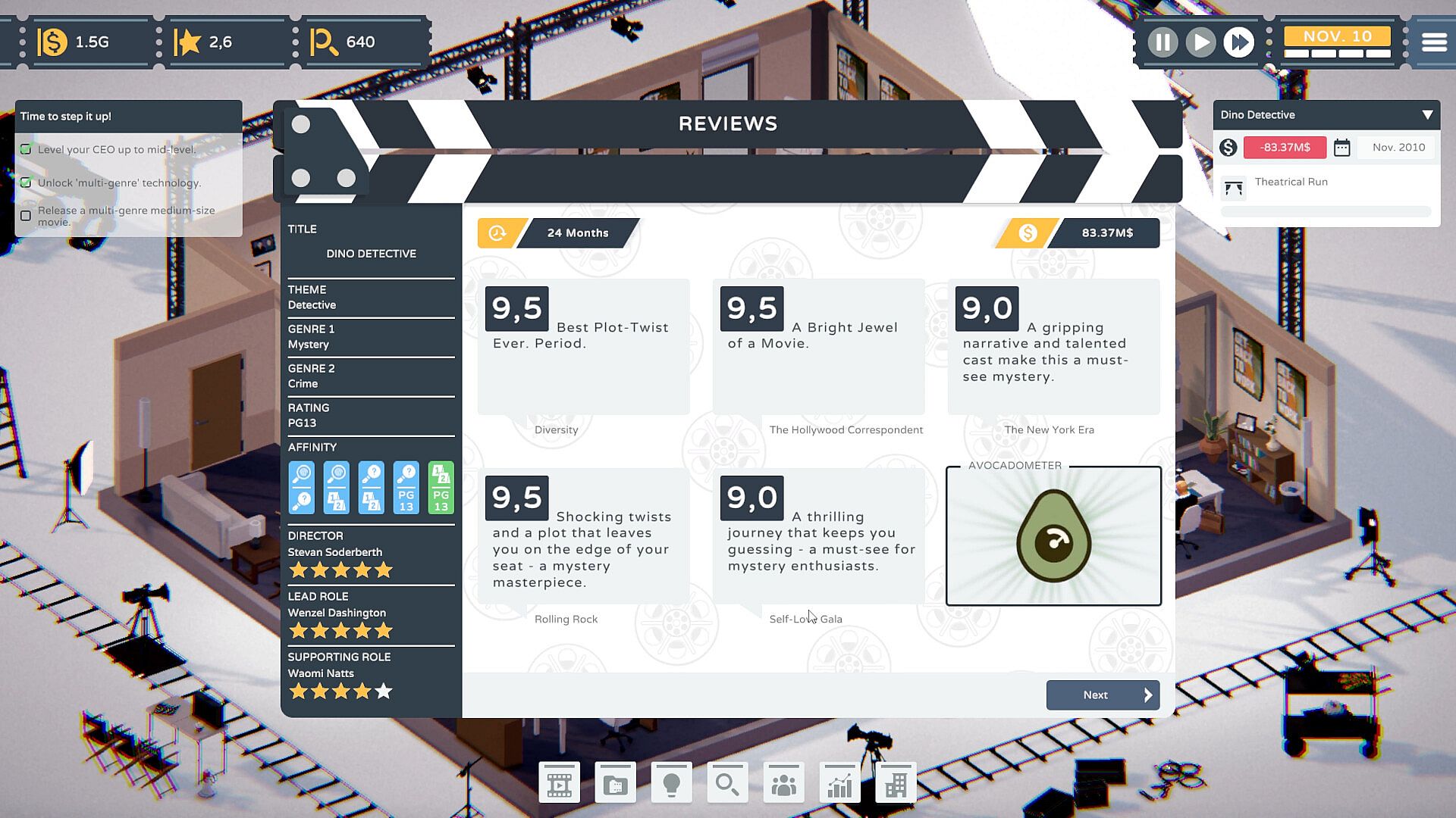 The Executive is a sandbox business simulation game that lets you rewrite the history of Hollywood from the 1970s to today. As the founder of a scrappy production company, you’ll produce the movies you’ve always dreamed of, manage ambitious franchises, and build a studio that rivals the industry’s greatest. Navigate the challenges of the movie business, outmaneuver your competition, and decide whether to chase critical acclaim or box office domination.