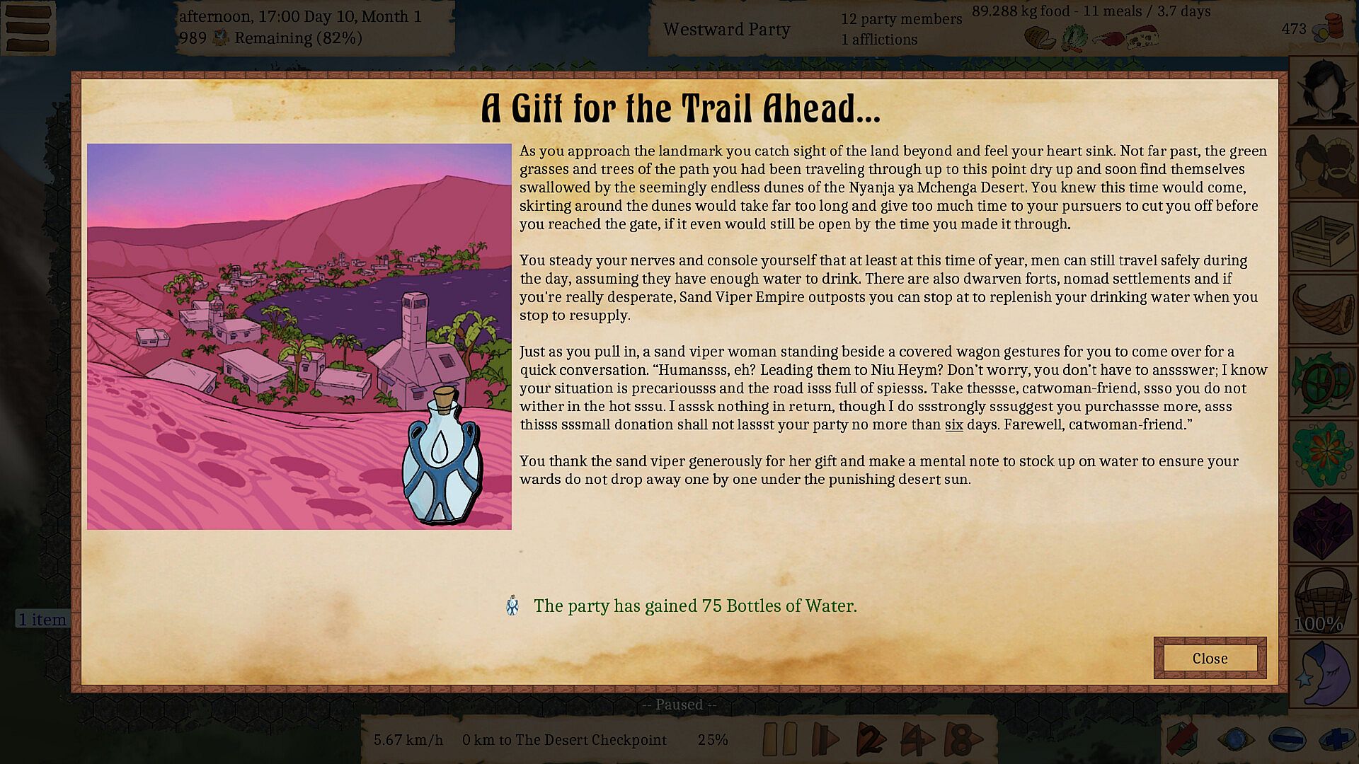 You are an elf guide tasked with leading a small party of humans over a thousand kilometers west across all of Aphrodisia to the city of Niu Heym and the Portal Gate. With any luck, at least some of your wards will be able to return to the humans' ancestral homeworld before the portal gate runs out of rift charges. It is your job to try and get them there, but forces are acting against you, wishing to take some, or all, of your charges and to transform or enslave them.