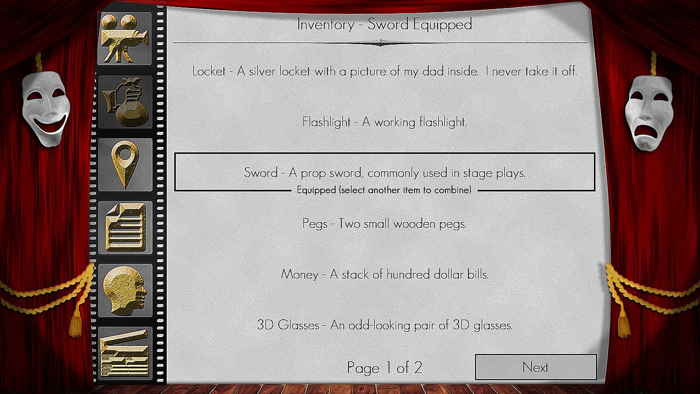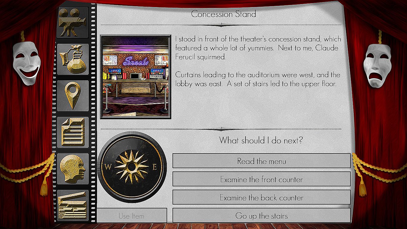 The Filmmaker combines the best elements of interactive fiction, visual novels, and gamebooks with a graphic user interface that emulates the look of early 1990s text adventures. It features beautiful artwork and cinematic music. In place of a text parser is a context-specific multiple choice menu. A compass allows you to travel from room to room, and separate inventory, map, journal, and character screens are available at the push of a button.It plays like an interactive novel. You make choices that determine what happens next in the story. But unlike in traditional gamebooks and visual novels, The Filmmaker also features more advanced adventure-based game mechanics, including locations to explore, items to interact with, characters to meet, and puzzles to solve.