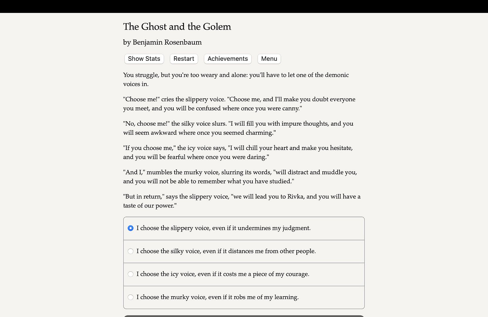 The Ghost and the Golem is an interactive historical fantasy novel by Benjamin Rosenbaum. It's entirely text-based, 450,000 words and hundreds of choices, without graphics or sound effects, and fueled by the vast, unstoppable power of your imagination.