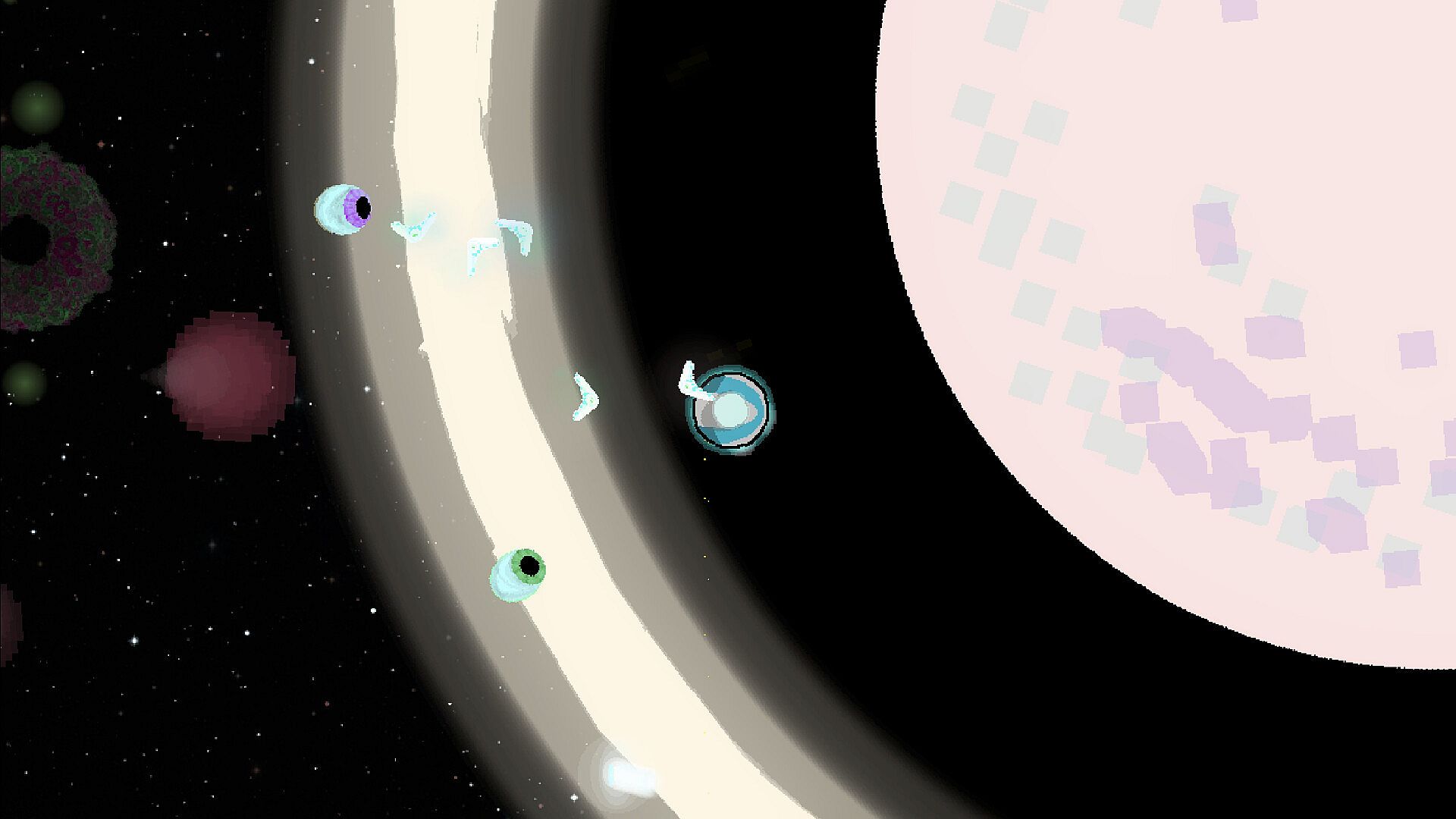 Fibonacci spirals in enemy movement. Golden ratio calculations. Bezier curves. Mathematical elegance wrapped in chunky SNES pixel art, nine-layer parallax backgrounds, and a Tron-like wireframe aesthetic. A dying star's accretion disk glows against the void while rainbow mob swarms flow toward Oria.